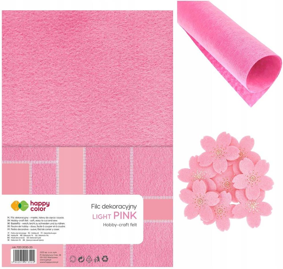 FILC DEKORACYJNY 20x30cm 1,5 mm miękki JASNORÓŻOWY FILC JASNORÓŻOWY A4 10szt 1,5mm miękki pluszowe arkusze dekoracyjne Happy Color Miękki gruby filc dekoracyjny od Happy Color o intensywnych kolorach. Filc jest miękki dzięki czemu bardzo dobrze nadaje się do scrapbookingu, ręcznych robótek takich jak np. wyszywanie lub klejenie. Łatwy do cięcia i szycia. Żywe kolory. Wytrzymały, nie rozrywa się podczas szycia. Doskonały do tworzenia dekoracji i maskotek. Grubość 1,5 mm. Wielkość A4 20x30 cm. Opakowanie zawiera 10 arkuszy. Miękki filc dekoracyjny z włókniny akrylowej o jakości wełnianego, w intensywnych kolorach. Doskonały do tworzenia zabawek, torebek. Grubość 1,5 mm. Format 20 x 30 cm. 10 arkuszy w opakowaniu.