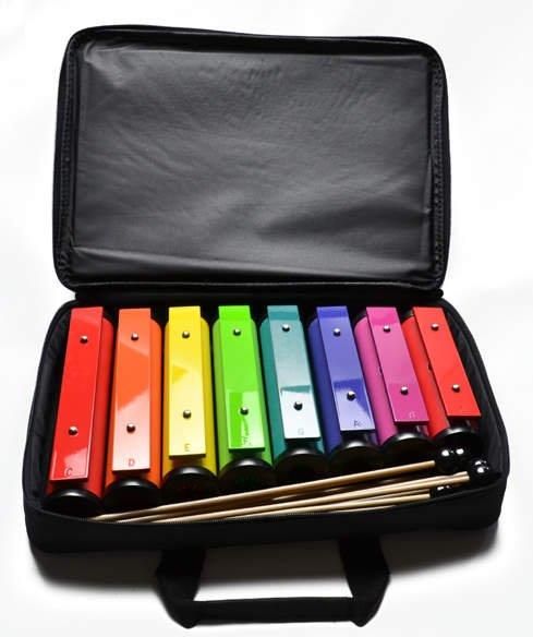 Bum Bum Dzwonki na tubach zestaw diatoniczny Zestaw 8 dzwonków na tubach w systemie kolorów Chroma Notes – kolory zgodne z innymi instrumentami Bum Bum Rurki. Dzwonki oczarowują swoim długim, blisko 5 sekundowym wybrzmieniem. Pierwsze słowa wypowiedziane po usłyszeniu tego dźwięku to najczęściej: Ale piękne.. Każda metalowa sztabka pomalowana jest w kolorze danego dźwięku i solidnie przykręcona do plastikowego rezonatora. Użyty system kolorów to Chroma-Notes™, najpopularniejszy na świecie i kompatybilny z Bum Bum Rurkami i naszymi wydawnictwami. 8 pałeczek pozwala grać jednocześnie ośmiu osobom, każdej na innym dzwonku. Wiemy jak ważny jest pierwszy kontakt z instrumentem, dlatego nasi Klienci cieszą się nim od pierwszych chwil. W dołączonym śpiewniku znajdują nuty w takich samych kolorach jak dzwonki i Bum Bum Rurki®. W szerokie płytki łatwo trafić nawet małym dzieciom, a dzięki kolorom w moment rozpoznają jaką melodię zaczęły grać. Każdy dzwonek jest dokładnie nastrojony. To wyróżnia ten produkt na tle innych dostępnych na rynku. Dzwonki na tubach diatoniczne w kolorach Chroma Notes dedykowane są dla: – grup przedszkolnych i szkolnych – nauczycieli – wychowawców – rodziców i dzieci – grupom artystycznym – każdemu, kto chce w łatwy i szybki sposób pobawić się muzycznie Dzięki dołączonemu śpiewnikowi z kolorowymi nutami, pierwsze wystąpienie może nastąpić już kilka minut po rozpakowaniu zestawu!