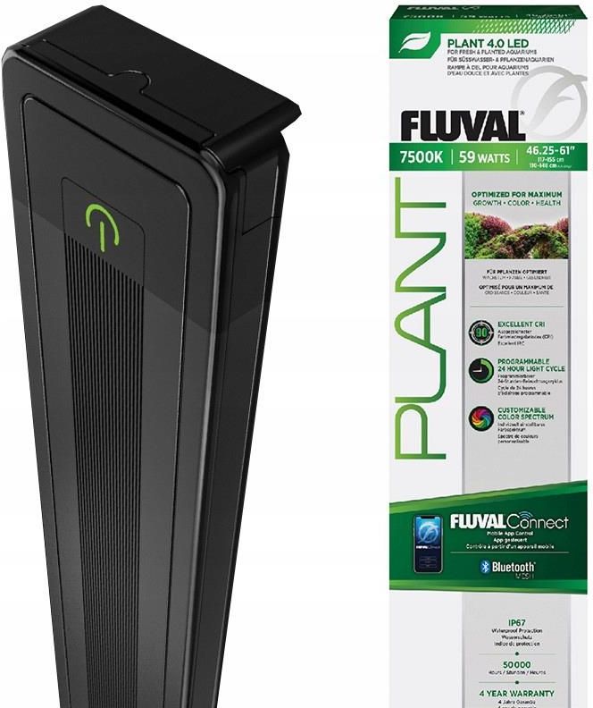 FLUVAL Oświetlenie do akwarium PLANT 4.0 LED 59W do akwarium 117,5-155,1cm Fluval Plant 4.0 LED to inteligentna lampa akwariowa, która została opracowana z myślą o zapewnieniu roślinom wodnym idealnych warunków do wzrostu i zdrowego rozwoju. Dzięki technologii pełnospektralnego światła oraz wysokiemu współczynnikowi oddawania barw (CRI 90), akwarium nabiera naturalnego wyglądu, a kolory roślin i ryb stają się intensywne i realistyczne. Solidne wykonanie w Niemczech to gwarancja trwałości, jakości i niezawodności. Sterowanie odbywa się całkowicie zdalnie poprzez aplikację FluvalConnect, która pozwala na pełną personalizację – od niezależnych kanałów kolorystycznych, przez programowanie cykli świetlnych, aż po korzystanie z gotowych efektów i profili. Zawartość zestawu: Lampa LED z przewodem zasilającym (2 m) Teleskopowe uchwyty montażowe Uchwyty podwyższające (riser brackets) Zasilacz Podkreśl naturalne piękno swojego akwarium i zapewnij roślinom idealne warunki do wzrostu. Fluval Plant 4.0 LED 59W to perfekcyjne połączenie nowoczesnej technologii i natury. Najważniejsze zalety Fluval Plant 4.0 LED: Pełne spektrum światła – wspiera bujny wzrost roślin, ich zdrowie i wybarwienie. Regulowane wsporniki przesuwne – bezproblemowy montaż na akwariach o szerokości 117–155 cm, także niestandardowych. CRI 90 – wierne odwzorowanie kolorów, naturalna prezentacja roślin i ryb. Sterowanie przez aplikację FluvalConnect – wygodna, intuicyjna obsługa z poziomu smartfona. Program dobowy 24h – realistyczne odtworzenie cyklu dnia i nocy (świt, południe, zmierzch, noc). Gotowe tryby oświetleniowe – szybki wybór najlepszych ustawień dla różnych typów akwariów. Wodoodporność IP67 – pełna ochrona przed wodą, wilgocią i kurzem. Wysokiej jakości soczewka szklana – trwała, czysta transmisja światła bez strat. Obudowa z aluminium lotniczego – skuteczne chłodzenie i większa żywotność diod LED. Elastyczne możliwości montażu – teleskopowe uchwyty i uchwyty podwyższające w zestawie. Opcja zawieszenia – możliwość instalacji na dedykowanym zestawie montażowym (sprzedawanym osobno). Dane techniczne Rodzaj oświetlenia: LED Liczba diod LED: 336 Moc: 59 W Strumień świetlny: 4 700 lm Długość akwarium (regulacja przesuwnych wsporników): 117,5-155,1 cm Żywotność diod: 50 000 godzin Napięcie: 100-240 V / 50-60 Hz, 24 V Długość kabla zasilającego (z zasilaczem): 2,6 m Klasa ochronności obudowy lampy: IP67 Montaż: Na krawędzie szyb akwarium Ustawienie 24-godzinnego cyklu dobowego: Tak Połączenie: Bluetooth Dedykowana aplikacja: FluvalConnect (Android / iOS) Przeznaczenie: Akwarium słodkowodne, roślinne