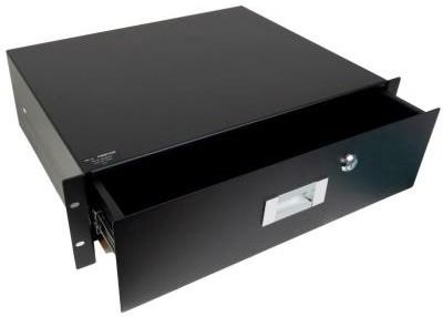 Szuflada metalowa do szafy 3 U 19" z mocowaniem frontu Solidna metalowa szuflada do szafy rack 3 U 19" z mocowaniem śrubowym na froncie. Szuflada z dostępem z przodu jest zamykana i może być używana do bezpiecznego przechowywania dokumentacji technicznej, akcesoriów lub ewentualnie mikrofonów itp. Wykończenie czarną emalią. Wymiary: 435 x 133,5 x 350 (głębokość) Waga: 6,2 kg Akcesoria: nakrętki i śruby do montażu