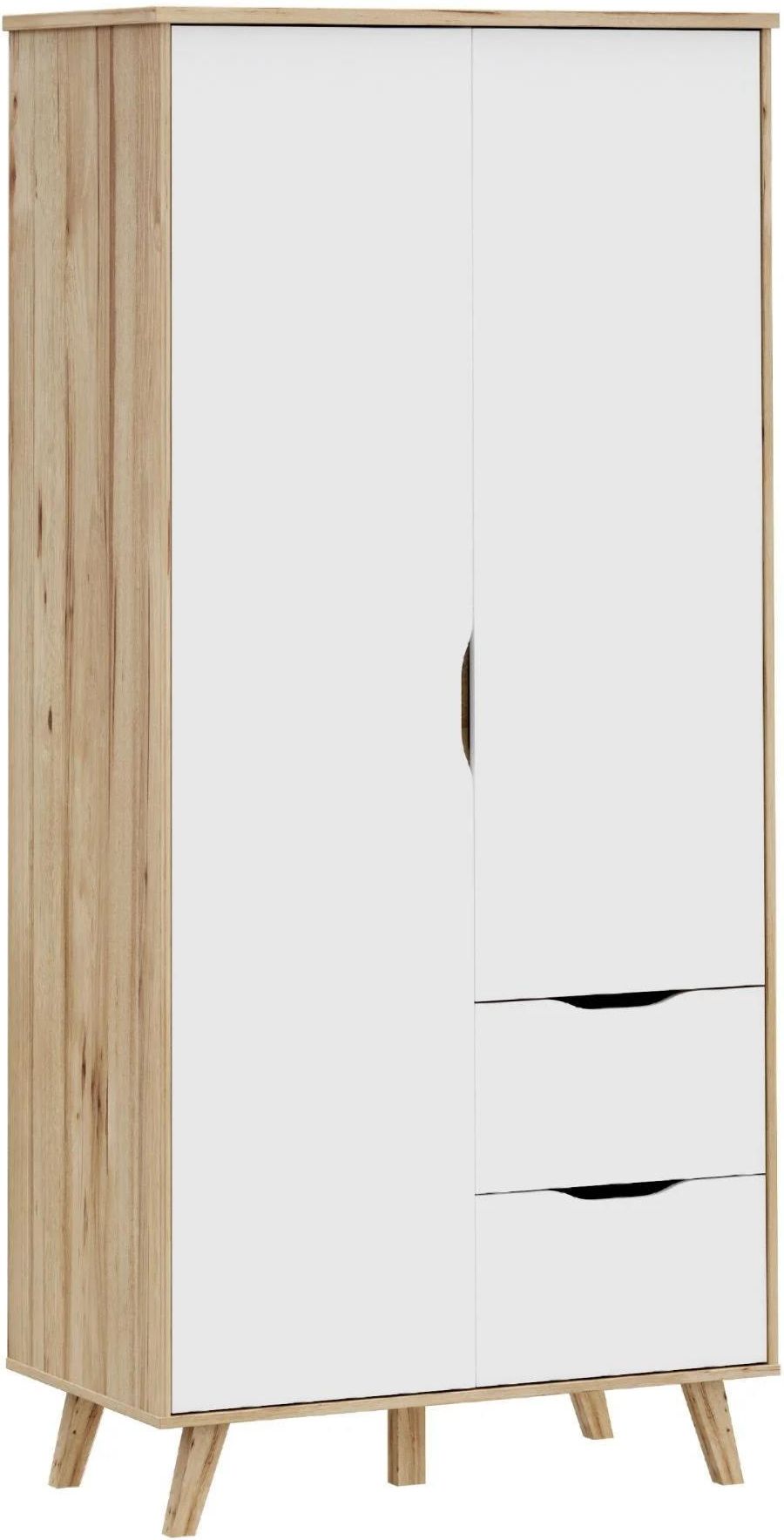Mała szafa z kolekcji Vankka, od Meble Forte, z powodzeniem sprawdzi się w niedużej sypialni, zwłaszcza młodzieżowej. Można również wykorzystać ją w przedpokoju, aby łatwiej utrzymać w nim porządek i rozświetlić aranżację. Mebel ma jasne wybarwienie i wysokie nóżki, dzięki którym prezentuje się lekko i nie przytłacza żadnego wnętrza. Jakie zalety posiada szafa na ubrania Vankka? Biała szafa dwudrzwiowa Vankka została wykonana z wysokiej jakości płyty meblowej, odpornej na uszkodzenia i łatwej do utrzymania w czystości. Korpus mebla osadzono na wysokich nóżkach, które dodają mu elegancji, a także ułatwiają sprzątanie podłóg. Wnętrze szafy zostało zagospodarowane za pomocą półek, drążka odzieżowego i dwóch szuflad, co pozwala wygodnie przechowywać w niej ubrania poukładane, ubrania na wieszakach, bieliznę i drobne akcesoria. Dostęp do wnęk mebla zapewniają natomiast podfrezowane uchwyty, podkreślające nowoczesny, minimalistyczny design całej bryły. Jak prezentuje się mała szafa Vankka? Mniejsza, wąska szafa do sypialni z kolekcji Vankka ma prostą linię i jasne wybarwienie, dzięki któremu nie przytłacza wnętrza, lecz optycznie je powiększa. Mebel wykończono dekorem Deska Dębowa oraz Biel, co wpisuje szafę w skandynawski styl aranżacyjny. Białe fronty efektownie odbijają światło, dodając wnętrzu świeżości i elegancji. Natomiast rysunek drewna wprowadza do sypialni ciepły motyw natury. Szafa może trafić zarówno do pokoju sypialnego czy garderoby, jak i do niewielkiego przedpokoju. Wymiary szafy Szerokość: 94,7 cm Głębokość: 52,7 cm Wysokość: 201,5 cm