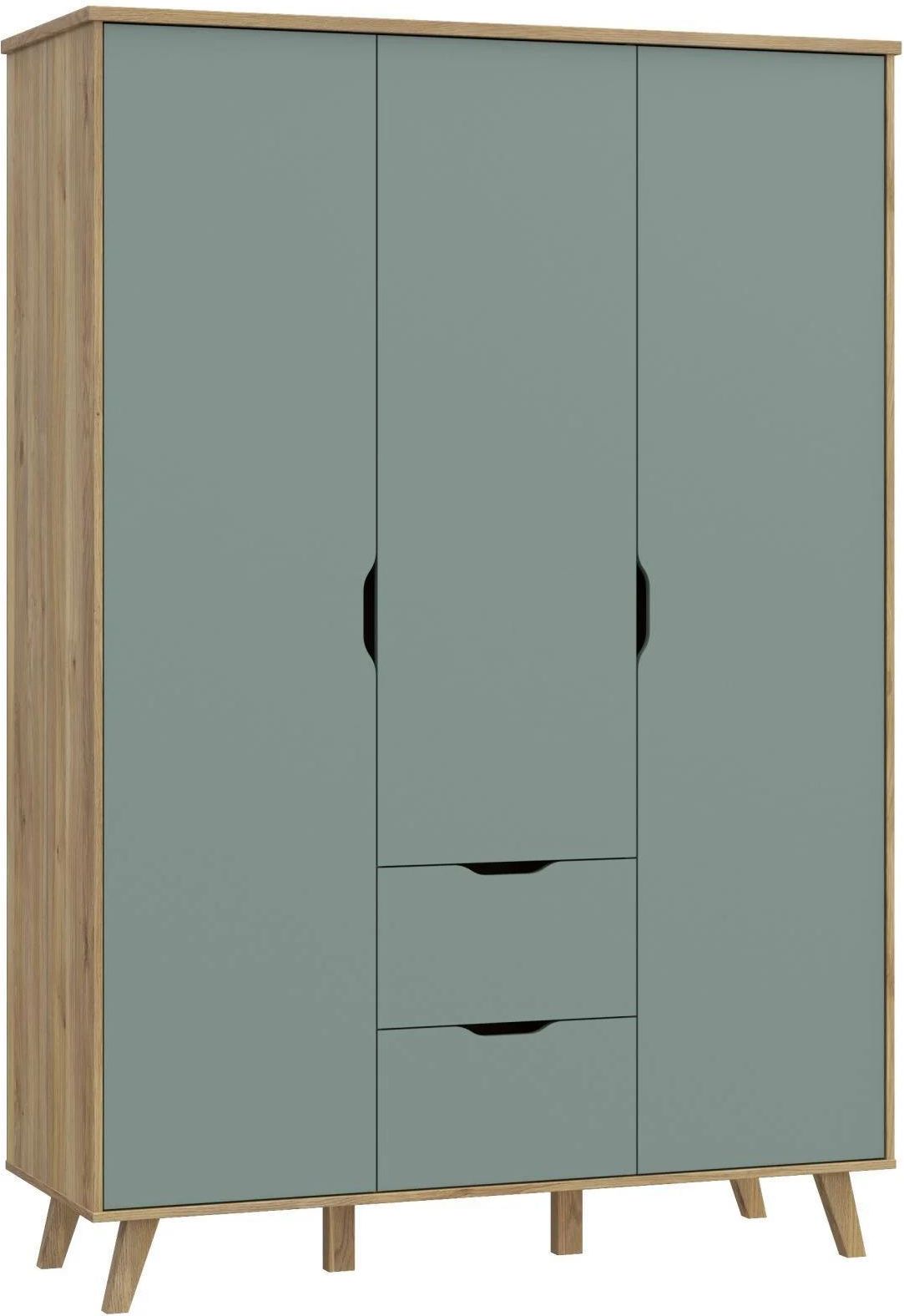 Pojemna szafa Vankka, producenta Meble Forte, wyróżnia się modną kolorystyką i praktycznym zagospodarowaniem swojego wnętrza. Mebel oferuje użytkownikowi zarówno półki, jak i drążek na wieszaki. Dysponuje także funkcjonalnymi szufladami, w których można przechowywać wygodnie drobne przedmioty, jak bielizna, kosmetyki czy biżuteria. Czym charakteryzuje się szafa ubraniowa Vankka? Szafa trzydrzwiowa z kolekcji Vankka została wykonana z wysokiej jakości płyty meblowej, odpornej na uszkodzenia i niewymagającej w pielęgnacji. Mebel posiada nóżki, które unoszą jego bryłę nad podłogą, dodając jej optycznej lekkości. We wnętrzu szafy użytkownik znajdzie pięć półek, drążek ubraniowy oraz dwie szuflady. Fronty mebla uchylane są za pomocą podfrezowanych uchwytów, dzięki czemu cała bryła pozostaje gładka, minimalistyczna i nowoczesna. Gdzie sprawdzi się duża szafa Vankka? Prezentowana duża szafa z szufladami Vankka to nowoczesny mebel w stylu skandynawskim, wybarwiony na dekor dębu i jasnej, szałwiowej zieleni. Takie zestawienie kolorów sprawia, że szafa wnosi do wnętrza przytulność i elegancję. Pozwala odświeżyć wystrój, ale też podkreślić jego minimalistyczny charakter. Mebel sprawdzi się w każdej sypialni - również tej młodzieżowej. Bez trudu pomieści całą garderobę i pomoże zachować idealny porządek w pokoju sypialnym. Wymiary szafy Szerokość: 139,4 cm Głębokość: 52,7 cm Wysokość: 201,5 cm