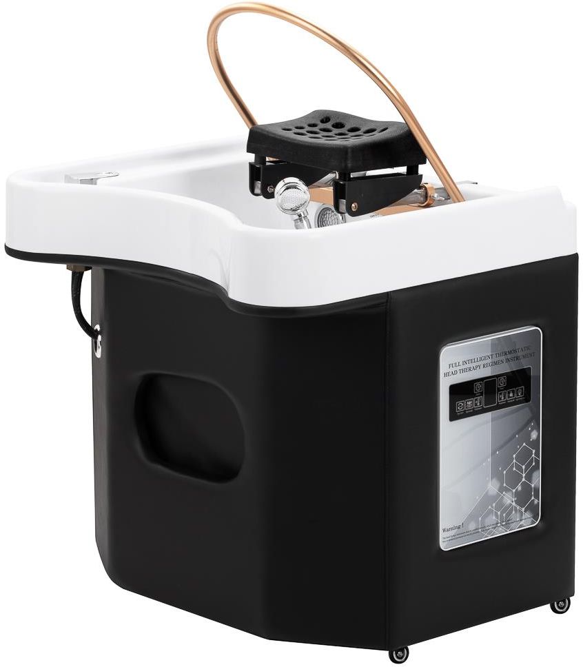 Gabbiano to luksusowa włoska marka urządzeń oraz mebli fryzjerskich, którą wyróżnia niezawodność, jakość i estetyka wykonania oraz wysoki komfort użytkowania. W ofercie posiada duży wybór funkcjonalnych elementów wyposażenia salonu, takich jak fotele, myjnie czy infrazony. Przenośna myjnia SPA dla kompleksowej pielęgnacji i relaksu Gabbiano Head SPA 050 to elegancka, mobilna myjnia stworzona z myślą o profesjonalnych zabiegach pielęgnacyjnych i relaksacyjnych. Urządzenie można przystawić do leżanki, tworząc komfortową strefę do pielęgnacji skóry głowy i włosów w atmosferze luksusowego SPA. Idealnie sprawdzi się podczas luksusowych zabiegów japońskiego Head SPA, oferując szeroki zakres terapii na skórę głowy i włosy. Umożliwia łączenie technik hydroterapii, masażu strumieniami wody, aromaterapii oraz światłoterapii, zapewniając holistyczne doświadczenie pielęgnacyjne. Zaawansowane technologie zapewniają niezrównany komfort klientom i specjalistom w branży beauty & wellness. Gabbiano Head Spa 050 to wyjątkowe połączenie tradycji i innowacji, które zapewnia głęboki relaks, odżywienie i nawilżenie skóry głowy oraz włosów. Czym jest japońskie head SPA? Japońskie Head SPA to luksusowy rytuał pielęgnacyjny, który łączy tradycyjne techniki z nowoczesną kosmetologią. Zabieg koncentruje się na skórze głowy, włosach i twarzy, oferując oczyszczenie, nawilżenie, stymulację krążenia oraz głęboki relaks. Wykorzystuje peelingi, maski, esencje i olejki eteryczne, by usuwać zanieczyszczenia, wzmacniać cebulki włosowe i poprawiać kondycję włosów. Efektem są mocniejsze, lepiej nawilżone i bardziej odporne włosy oraz uczucie odprężenia, do którego klienci chętnie powracają. Luksusowy masaż wodny Waterfall Head SPA Złoty łuk z regulacją kąta nachylenia to innowacyjne rozwiązanie do zabiegów Waterfall Head SPA. Strumienie wody delikatnie masują skórę głowy, poprawiając krążenie, redukując napięcie i wspierając regenerację włosów. System zamkniętego obiegu pobiera wodę z misy i kieruje ją z powrotem, zapewniając ciągły, relaksujący masaż. Wodospad zapewnia dogłębne oczyszczenie skóry głowy oraz odprężenie, przynosząc ulgę w dolegliwościach takich jak bóle głowy czy sztywność karku. To połączenie technologii i relaksu, które wspiera zdrowie włosów i dobre samopoczucie. Efektywna terapia parą Rewolucyjna metoda pielęgnacji wykorzystuje właściwości pary wodnej do regeneracji i nawilżenia włosów. W zestawie znajduje się specjalistyczne urządzenie wytwarzające parę oraz dedykowana osłona na umywalkę, która umożliwia precyzyjne kierowanie jej na włosy. Dzięki temu składniki aktywne zawarte w maskach, ampułkach i innych preparatach pielęgnacyjnych są skuteczniej wchłaniane, wspierając odbudowę i wzmacnianie włosów. Terapia parowa poprawia ich strukturę, zwiększa odporność na uszkodzenia i przywraca zdrowy blask, sprawiając, że stają się bardziej miękkie, elastyczne i pełne życia. Dodatkowym atutem zabiegu jest możliwość wykorzystania olejków eterycznych, które pod wpływem pary uwalniają relaksujące aromaty. Połączenie terapii parowej z aromaterapią potęguje efekt odprężenia, tworząc wyjątkowe, kojące doświadczenie zarówno dla ciała, jak i zmysłów. Dotykowy panel sterowania Intuicyjny panel dotykowy zapewnia pełną kontrolę nad parametrami zabiegu, zapewniając wygodę użytkowania i łatwość obsługi. Umożliwia regulację czasu pracy, temperatury oraz intensywności strumienia wody – do wyboru są trzy tryby: soft, comfort i strong. Za jego pomocą można również uruchomić funkcję światłoterapii, czyli podświetlenie misy, które tworzy relaksującą atmosferę i wspiera regenerację. Dodatkowym udogodnieniem jest pilot zdalnego sterowania, umożliwiający obsługę urządzenia do terapii parowej z dowolnego miejsca w gabinecie. Komfortowe użytkowanie Głęboka misa w eleganckim odcieniu bieli została zaprojektowana z myślą o maksymalnej wygodzie zarówno dla klienta, jak i osoby wykonującej zabieg. Jej konstrukcja skutecznie zapobiega rozchlapywaniu wody oraz kosmetyków, co ułatwia utrzymanie czystości i porządku w miejscu pracy. Unikalne wygięcie nie tylko ułatwia dostęp osobie wykonującej usługę, ale także dodaje myjni eleganckiego, nowoczesnego charakteru. Przemyślane połączenie funkcjonalności i stylu, które podnosi standard każdej przestrzeni beauty & wellness. Przemyślane udogodnienia i akcesoria Myjnia jest wyposażona w baterię z mieszaczem, co umożliwia łatwe dopasowanie temperatury do preferencji klienta. Dedykowane miejsce na słuchawkę natryskową ułatwia pracę, a chromowany korek ze specjalnym sitkiem pozwala na kontrolę przepływu wody oraz utrzymanie wysokich standardów higieny w salonie. Przyłącze wody ukryto wewnątrz obudowy za osłoną z elastycznego materiału, co pozwala estetycznie zamaskować instalację hydrauliczną i zachować spójny, profesjonalny wygląd urządzenia. Funkcjonalna estetyka do każdego gabinetu SPA Urządzenie przyciąga wzrok nowoczesną formą i kontrastowym zestawieniem kolorów – eleganckiej bieli z głęboką czernią. Minimalistyczna bryła z zaokrąglonymi krawędziami prezentuje się stylowo i profesjonalnie, doskonale wpisując się w wystrój nowoczesnych salonów kosmetycznych oraz gabinetów SPA. Myjka wyposażona jest w kółka z możliwością blokady, co zapewnia wygodę transportu oraz stabilność w trakcie użytkowania. To idealne rozwiązanie do mniejszych przestrzeni – jedno mobilne urządzenie może obsługiwać kilka stanowisk zabiegowych, co czyni je niezwykle funkcjonalnym i ekonomicznym wyborem. Wymiary podano na zdjęciu. W zestawie: myjnia mobilna, kółka, nakładka na misę myjni (steam hood), parownica. Dane: Kolor obicia: odcienie czerni Kolor misy: odcienie bieli Kolor armatury: odcienie chr