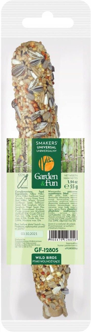 Pokarm w formie Smakersa idealny na każdą porę roku. Ptaki nie tylko w zimie potrzebuję dokarmiania, początek wiosny, okres lęgowy czy też ptaki zamieszkujące aglomeracje miejską ubogą w źródła pokarmu, potrzebują naszej pomocy. Karma uniwersalna to mieszanka nasion i zbóż chętnie zjadanych przez ptaki. Nasion słonecznika, zarówno całe jak i łuskane są przysmakiem ptaków i dostarczają energii. Drobne nasiona trzech gatunków prosa jak i mozga kanaryjska są idealne dla ziarnojadów, wróbli, mazurków, dzwońców, sójki itd. Skład: proso żółte, proso białe, nasiona słonecznika łuskane, nasiona mozgi kanaryjskiej proso czerwone, pszenica, nasiona słonecznika, nasiona krokoszu barwierskiego, sorgo czerwone, sorgo białe, nasiona nigru, siemię lniane, mąka pszenna.