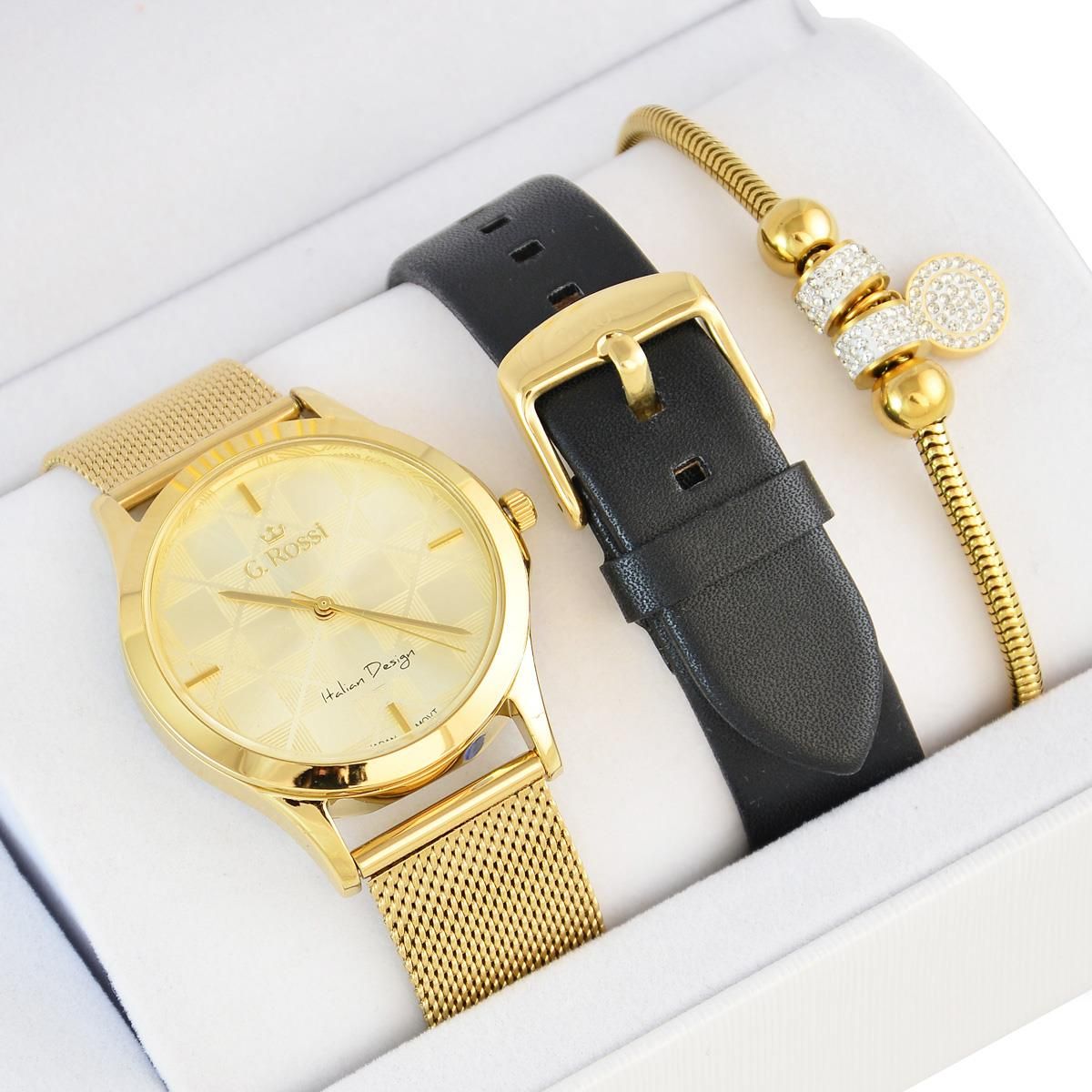 Zegarek damski G. ROSSI MIROE 10513-4A1 z dwoma paskami + bransoletka Już dziś wybierz swój nowy, elegancki, funkcjonalny, a co najważniejsze klasyczny zegarek, który sprawdzi się bez względu na okazję. Zegarek Greca wyposażony został w niezawodny mechanizm kwarcowy, zapewniający wieloletnią żywotność oraz precyzyjne odmierzanie czasu. Nowoczesna jasna tarcza z motywem ozdobnym zapewnia przejrzysty i czytelny wygląd. Koperta zegarka połączona została ze skórzanym paskiem i siatką mesh. Wodoszczelność 30M oznacza że, zegarek jest odporny na zachlapania. Czasomierze te wyprodukowane są z bezpiecznych materiałów, które nie tylko nadają się dla osób z wrażliwą skórą, ale i również dla alergików. Zegarek sprawdzi się jako prezent, który zachwyci swoim wyglądem, funkcjonalnością oraz będzie stanowił wartościową pamiątkę. Nasza firma oferuje również dodatkowo płatną usługę grawerowania, dzięki której możemy podarować bliskiej nam osobie pamiątkę w formie dedykacji na zegarku, co stanowi niepowtarzalny i wyjątkowy upominek. Idealny na prezent dla kobiet ceniących sobie styl i elegancję. Mechanizm: W zegarku osadzony został japoński mechanizm kwarcowy Miyota. Pasek/bransoleta: Skórzany, Stalowa siatka mesh. Koperta: Metalowa, pokryta utwardzaną powłoką IPS/IPG. Szkiełko: Mineralne. Tarcza: Sygnowana logiem producenta. Wodoszczelność: Water Resist 3 BAR (30M) zegarek jest odporny na przypadkowe zachlapania wodą np. podczas mycia rąk. Kolorystyka: Tarcza: kolor złoty, Wskazówki: kolor złoty, Koperta: kolor złoty, Pasek skórzany: kolor czarny, Siatka mesh: kolor złoty. Gwarancja: Pisemna 12 miesięcy. Wymiary: koperta: szer 38mm x wys 46 mm, grubość koperty: 10 mm, tarcza średnica: 31 mm, szerokość paska: 20 mm, maksymalny obwód: do 21 cm.