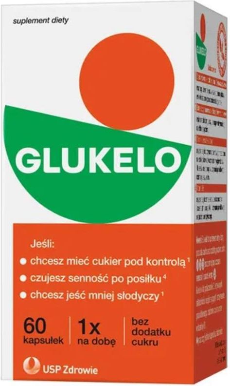 Glukelo 60 kapsułek Suplement diety Glukelo 60 kapsułek to suplement diety, który został stworzony z myślą o osobach pragnących utrzymać stabilny poziom cukru we krwi oraz zmniejszyć uczucie senności i spadek energii po posiłkach. Dzięki unikalnej formule, Glukelo łączy w sobie trzy aktywne składniki wspierające prawidłowy poziom glukozy we krwi oraz witaminę B6, która przyczynia się do zmniejszenia uczucia zmęczenia i znużenia także po posiłku. Głównym składnikiem aktywnym suplementu diety Glukelo jest ekstrakt z liści gurmaru (Gymnema sylvestre) - standaryzowany na 25% kwasu gymnemowego. Gurmar wspiera wielokierunkowo w tym: przyczynia się do utrzymania prawidłowego poziomu glukozy we krwi oraz zmniejsza odczucie słodkiego smaku, co może pomóc w ograniczeniu spożycia słodyczy. Ekstrakt z kory cynamonowca cejlońskiego (Cinnamomum verum) obecny w preparacie GLukelo wspiera metabolizm glukozy i pomaga w utrzymaniu jej prawidłowego poziomu we krwi. Chrom jako ważny pierwiastek śladowy przyczynia się do utrzymania prawidłowego metabolizmu makroskładników odżywczych m.in. poprzez spowolnienie trawienia cukrów z pożywienia oraz ograniczeniu ich wchłaniania w jelicie. Pomaga w utrzymaniu prawidłowego poziomu glukozy we krwi. Witamina B6 przyczynia się do zmniejszenia uczucia zmęczenia i znużenia (szczególnie po posiłkach) i utrzymania prawidłowego metabolizmu energetycznego. Produkt nie zawiera dodatku cukru. Porcja produktu zalecana do spożycia w ciągu dnia: 1 kapsułka. Składniki ekstrakt z liści gurmaru (Gymnema sylvestre) standaryzowany na 25% kwasu gymnemowego; hydroksypropylometyloceluloza (kapsułka); ekstrakt z kory cynamonowca cejlońskiego (Cinnamomum verum); średniołańcuchowe kwasy tłuszczowe; chlorowodorek pirydoksyny (witamina B6); pikolinian chromu (chrom). Składnik Ilość w 1 kapsułce % RWS* Ekstrakt z liści gurmaru 400 mg - – w tym: kwas gymnemowy 100 mg - Ekstrakt z kory cynamonowca cejlońskiego 50 mg - Witamina B6 1,3 mg 93% Chrom 40 µg 100% *RWS – Referencyjna Wartość Spożycia Masa netto 60 kapsułek Suplementy diety nie mogą być stosowane jako substytut (zamiennik) zróżnicowanej diety ani zdrowego trybu życia. Nie należy przekraczać zalecanej porcji produktu do spożycia w ciągu dnia. Suplementy diety powinny być przechowywane w sposób niedostępny dla małych dzieci. Przed zastosowaniem produktu sugerujemy zapoznanie się z dokładnymi informacjami podanymi na opakowaniu lub załączonej ulotce. Warunki przechowywania Przechowywać w szczelnym opakowaniu. W suchym i chłodnym miejscu, w sposób niedostępny dla dzieci. Chronić przed światłem. Producent USP Zdrowie Sp. z o.o. ul. Poleczki 35, 02-822 Warszawa