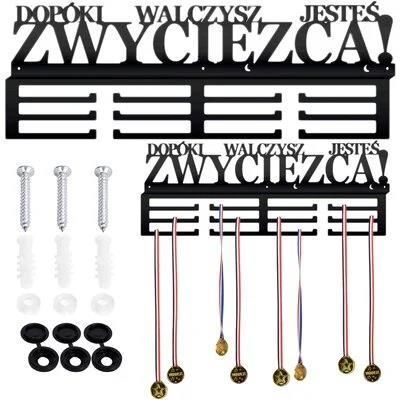 Wieszak na medale GOCKOWIAK to stylowy i praktyczny element dekoracyjny, must have na liście każdego, kto trenuje. Wycięty precyzyjną technologią laserową. Metalową konstrukcję zabezpieczono proszkowo matowym lakierem w czarnym kolorze. Dwanaście uchwytów pomieści od sześćdziesięciu do stu medali. W komplecie: kołki rozporowe i zaślepki w kolorze wieszaka.