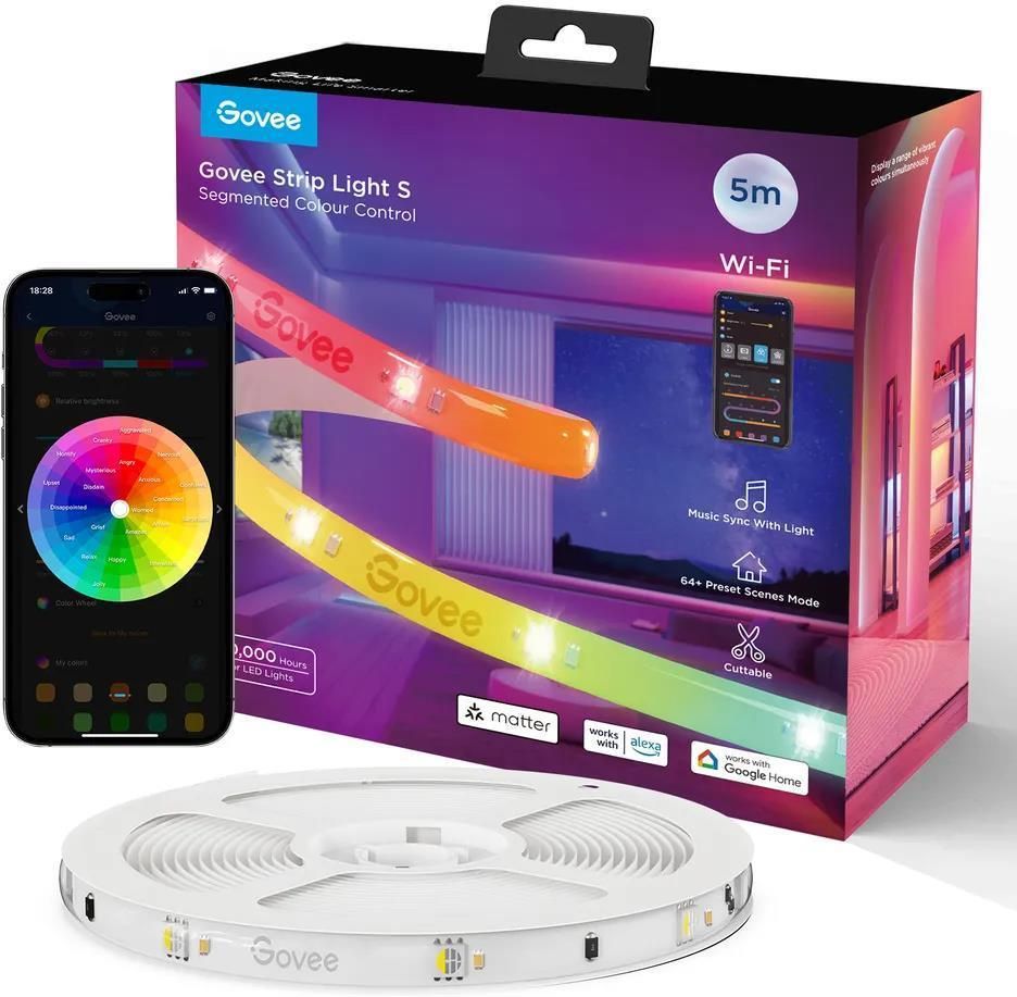 Taśma LED Govee WiFi RGBICW 5 m Kod produktu: H612ACD1 Rodzaj produktu: Taśma LED Łączność Wi-Fi, Bluetooth Sterowanie z poziomu aplikacji Sterowanie głosowe 16 milionów kolorów - technologia RGBICW, 64 tryby scen i kolory DIY Synchronizacja z muzyką poprzez zintegrowany mikrofon i tryby muzyki …