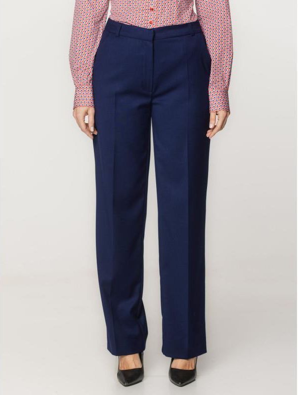 Klasyczne, granatowe spodnie garniturowe o gładkiej fakturze i prostym fasonie, z zaprasowanymi kantami