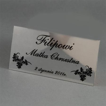 Grawerowanie na blaszce w kolorach: srebrny połysk, srebrny mat, złoty połysk, złoty mat Tekst grawerowania jest dowolny, jak również dowolna jest liczba znaków Przykłady wygrawerowanych blaszek na załączonych zdjęciach. Po złożeniu zamówienia prosimy o informację z wyborem czcionki i ozdobnika.