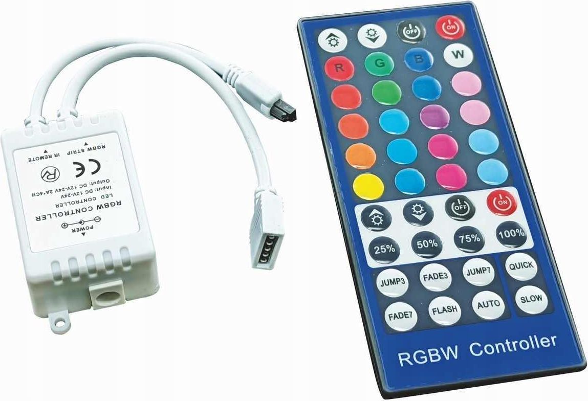 LED STRIP RGBW CONTROLLER - Sterownik RGB+W KONTROLER LED RGBW Z PILOTEM Napiecie nominalne [V]:: 12V/24V DC Klasa ochrony porażeniowej:: III Stopień ochrony IP:: IP20 Maksymalny prąd [A]:: 2/CH Kolor: biała. Nadaje się do ściemniania:: tak Wymiar - Długość [mm]: 49 Wymiar - Szerokość [mm]:: 35 Wymiar - Wysokość [mm]:: 22 Zasięg [m]:: 15 Znaki zgodności:: CE RoHS: tak