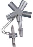 Haupa - Klucz uniwersalny do szaf budowlanych Uniwersalny klucz pomagający otworzyć większość szaf budowlanych w sytuacji zgubienia klucza dedykowanego. RAMIONA: czterokątny wewnętrzny 6-7 mm, 8-9 mm czterokątny zewnętrzny 5-10 mm klucz z podwójnym piórem 3-5 mm trójkątny wewnętrzny 7-9 mm trójkątny wewnętrzny 11 mm końcówka dwustronna SI do wkrętów z rowkiem i krzyżakowych łącznie z 5 mm kluczem czterokątnym wewnętrznym i półksiężycem na łańcuszku