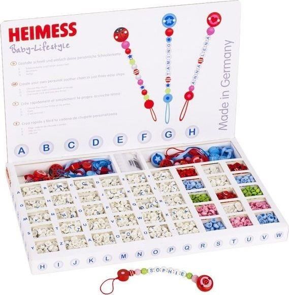 Zestaw uroczych koralików do wykonania personalizowanej zawieszki na smoczekJuż nigdy więcej problemów ze spadającym na ziemię smoczkiem. Zawieszka ma specjalny klips, za pomocą którego przytwierdza się zawieszkę do ubranka dziecka lub do wózka. Do drugiego końca można przymocować smoczek. Zawieszka jest wykonana z ekologicznych, drewnianych koralików. Koraliki zostały wygładzone dla bezpieczeństwa dziecka, dzięki czemu nie ma ryzyka zranienia. W zestawie znajdują się tasiemki, na które nawleka się drewniane koraliki. Perełki bardzo łatwo zaciska się na tasiemce. Solidne mocowania sprawiają, że perełki nie spadają z zawieszki. Do wyboru wszystkie litery alfabetu, tak by ułożyć imię dziecka. W zestawie także klipsy z motywami takimi jak biedronka, serduszko, gwiazdka czy truskawka. Klipsy mocuje się do ubrania dziecka, dzięki czemu smoczek nigdy nie spada na ziemię. Na łańcuszku można umieścić maksymalnie dziesięć koralików obok siebie.Z takim zestawem oznaczysz zawieszkę na smoczek dziecka jego imieniem i nadasz zawieszce spersonalizowany, atrakcyjny wygląd. Zawieszki od Heimess nadają się do wszystkich rodzajów smoczków. Koraliki nie posiadają ostrych krawędzi, a po złożeniu zawieszki dziecko nie jest w stanie samodzielnie zdjąć koralików z tasiemki. Bezpieczeństwo gwarantowane. W zestawie przyrząd do nawlekania. Weź tasiemkę, załóż odpowiednie koraliki, zaciśnij je na zawieszce i gotowe!W zestawie białe koraliki z literami oraz kolorowe perełki. Nawlekaj je na przemian, by zyskać niesamowitą zawieszkę.