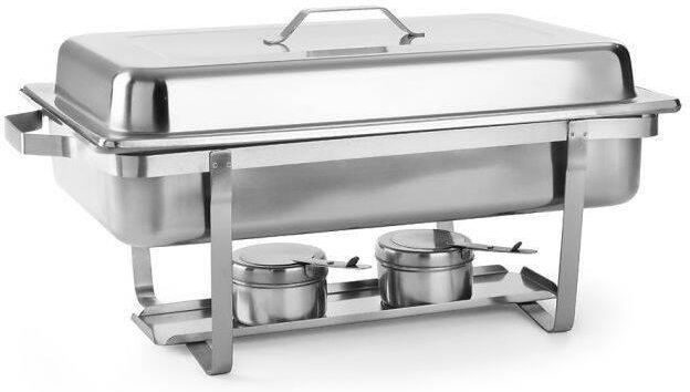 Podgrzewacz stołowy GN 1/1 o pojemności 9 l na paliwo. Wykonanie - stal nierdzewna 18/0. Polerowana pokrywa z uchwytem. W wyposażeniu pojemnik GN 1/1 o głębokości 65 mm, pojemnik na wodę oraz 2 naczynia na pastę.