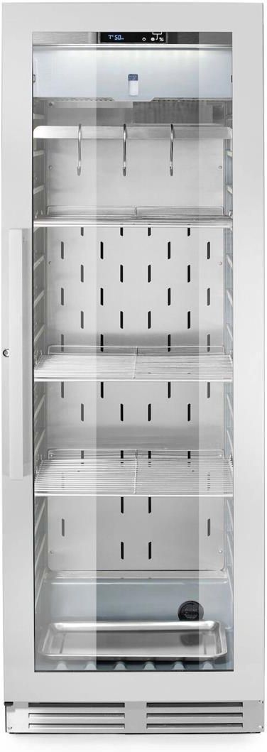 Szafa do sezonowania mięsa 352L, nr kat. 204962, 220-240V/170W, wymiary: 595x710x(H)1720 mm Hendi. Cechy produktu: Szafa do sezonowania mięsa zapewnia kontrolowany mikroklimat, dzięki któremu można uzyskać kruche i smaczne mięso. Szafa jest zaprojektowana tak, aby środowisko wewnątrz było w pełni kontrolowane, a wilgotność, wentylacja oraz sterylność były gwarantem stabilnych warunków wykorzystywanych do tradycyjnego, naturalnego dojrzewania mięsa. Stabilność warunków jest regulowana i kontrolowana. Obudowa, uchwyt drzwi oraz rama drzwi wykonane ze stali nierdzewnej AISI 304. Przeszklenie drzwi wykonano z 2 warstw hartowanego szkła, które blokuje promieniowanie UV i zapobiega nagrzewaniu komory. Drzwi są zamykane na zamek. Wewnątrz znajduje się pojemnik na wodę destylowaną z tworzywa ABS. Wodę należy uzupełniać samodzielnie. Niska wilgotność poniżej 15% jest sygnalizowana alarmem dźwiękowym. Otwarte drzwi przez dłużej niż 3,5 minuty również jest zabezpieczone alarmem dźwiękowym. Sterylizacyjna lampa UVC jest wbudowana i zapobiega rozwojowi bakterii i drobnoustrojów. Chłodzenie wewnątrz jest wspomagane wentylatorem. Zabezpieczona jest przez to właściwa cyrkulacja powietrza w komorze. Po obu stronach komory i w suficie znajdują się światła LED. W szafie znajdują się elementy wykonane ze stali AISI 304: 1 półka, 3 haki, drążek do zawieszania haków, tacka na sól, Dane techniczne: Temperatura 1-25oC. Wilgotność regulowana 60-85%. Czynnik chłodniczy R600a. Maksymalny udźwig półki: 30 kg. Maksymalny udźwig drążka do haków: 50 kg Maksymalne obciążenie pojedynczego haka: 25 kg. Odległość pomiędzy tacami mm: 90 Maksymalna pojemność kg: 126 Rodzaj izolacji: C5H26 Panel sterowania: Cyfrowy Napięcie V: 230 Moc wejściowa W: 170 Poziom hałasu dB: 69 Długość mm: 595 Szerokość mm: 710 Wysokość mm: 1720 Liczba półek: 3