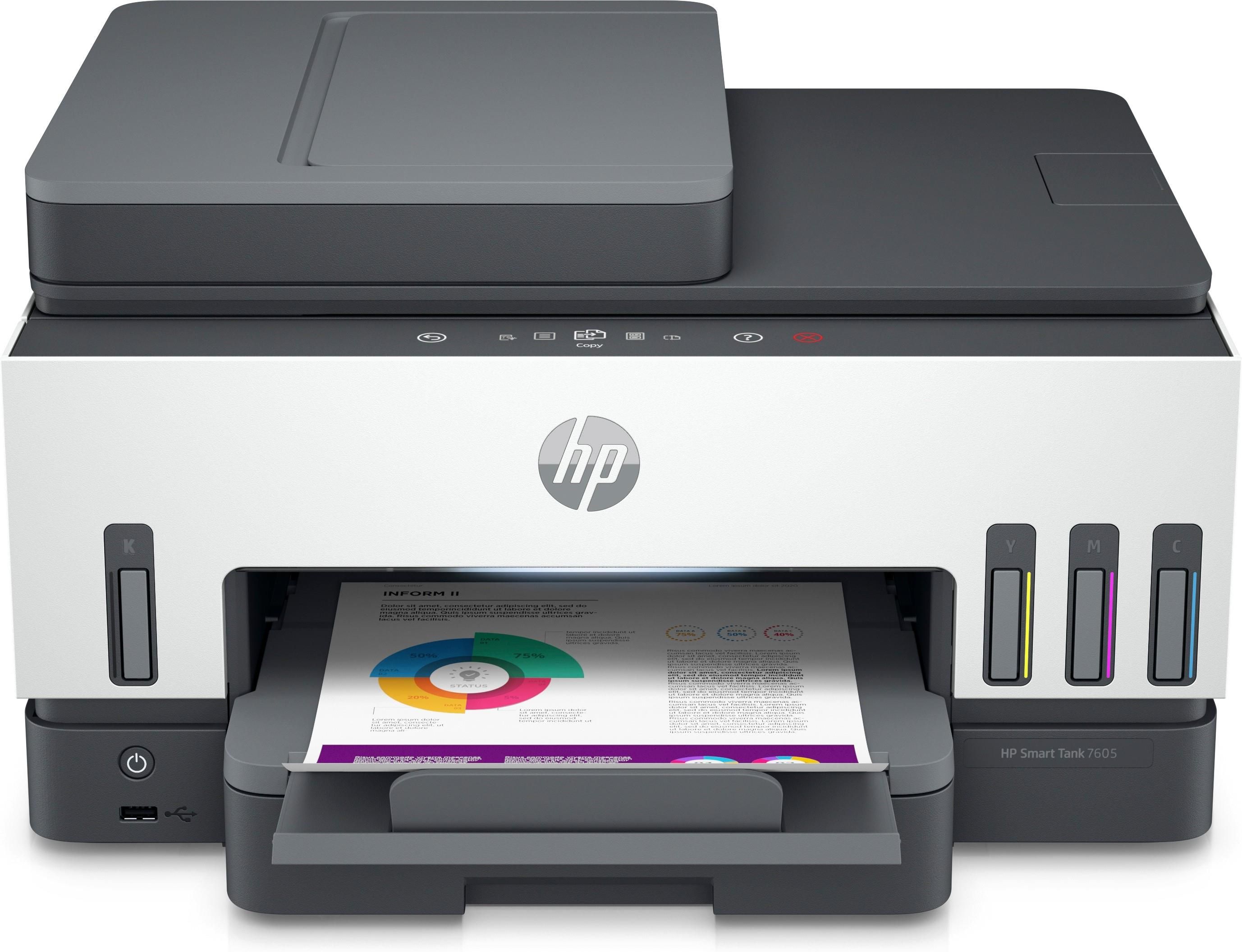 Urządzenie wielofunkcyjne HP Smart Tank 7605 Połącz się, pracuj i zwiększ produktywność firmy dzięki: Nowoczesnemu interfejsowi dotykowemu Automatycznemu druku dwustronnemu Bezprzewodowej łączności WiFi Doskonałej jakości obsługi tej drukarki bez kartridży DRUKARKA ATRAMENTOWA STRUMIENIOWA HP SMART …