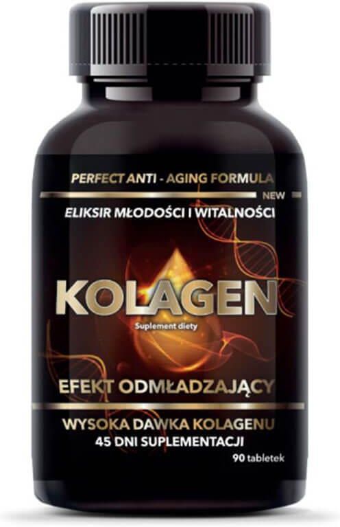 INTENSON Kolagen 90 tabl Kolagen jest bardzo ważnym białkiem dla tkanki łączącej stanowiącym aż 70% jej masy. Ciało ludzkie jest zdolne do wytworzenia co najmniej 28 różnych typów kolagenu, ale to właśnie kolagen typu I i III jest istotny dla zdrowia oraz pięknego wyglądu skóry. Jest on kluczowy dla utrzymania sprężystości skóry, dlatego wszelkie ubytki w ilości kolagenu wpływają na powstawanie zmarszczek, utratę jędrności oraz poziomu nawilżenia skóry. Zdolności regeneracyjne kolagenu maleją z wiekiem Kolagen jest białkiem strukturalnym, który powstaje w specjalnych komórkach o nazwie fibroblasty, w warstwie skóry właściwej. Fibroblasty produkują także inne strukturalne elementy tj. elastyna oraz kwas hialuronowy. Zarówno powstawanie, jak i rozkład kolagenu ma miejsce w skórze właściwej. Za rozkład odpowiadają enzymy, natomiast kolagen naprawia i zastępuje zniszczone komórki bądź buduje nowe struktury komórkowe przez całe nasze życie. Wraz z upływem lat, enzymy, które odpowiadają za rozkład kolagenu stają się coraz bardziej aktywne, a sama produkcja kolagenu przez fibroblasty się zmniejsza. W rezultacie, skóra w wieku 80 lat wykazuje cztery razy więcej zniszczonego kolagenu niż skóra w wieku 21-30 lat. Peptydy kolagenu pobudzają skórę do większej produkcji kolagenu W ciągu ostatniej dekady znacznie wzrosło zainteresowanie w temacie tego, co możemy zrobić, aby utrzymywać stały poziom kolagenu w skórze, zapobiec jego degradacji oraz pobudzać jego syntezę w starzejącej się skórze. Badania wykazały, że synteza kolagenu może być stymulowana poprzez peptydy pozyskane z naturalnych źródeł kolagenu. Peptydy kolagenu to łatwo przyswajalne białka. Białka te nie są szybko absorbowane przez ludzki system trawienny, dlatego tylko ich enzymatyczny rozkład do małych peptydów jest gwarancją, że będzie on łatwo przyswojony przez organizm. 1-2 tabletek dziennie. Nie należy przekraczać zalecanej porcji do spożycia w ciągu dnia. Nie stosować w przypadku uczulenia na którykolwiek ze składników. Produkt dla dorosłych. Spożywania produktu nie zaleca się kobietom w ciąży i karmiącym piersią. Produkt nie może być stosowany jako substytut zróżnicowanej diety. Ważne jest prowadzenie zdrowego trybu życia i zrównoważonego sposobu żywienia.  497,5mg hydrolizat kolagenu, substancja przeciwzbrylająca: stearynian magnezu.