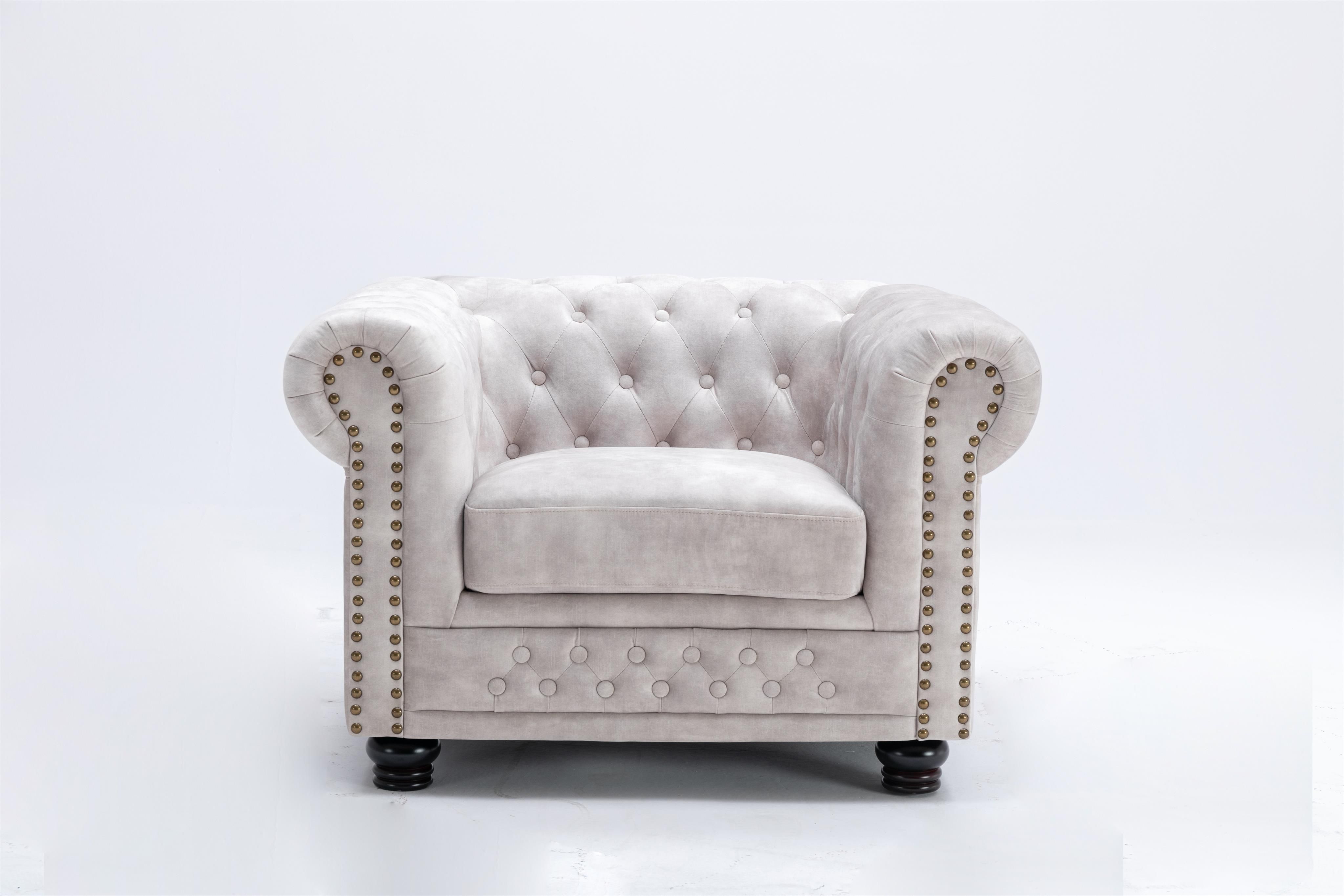 FOTEL CHESTERFIELD WELUR BEŻOWY Ten niezwykle elegancki fotel doskonale wkomponuje się zarówno w barokowy, jak i nowoczesny, przestronny salon. Model CHESTERFIELD wyróżnia się głównie zaokrąglonymi charakterystycznymi kształtami oraz starannie wykonanymi dekoracyjnymi pikowaniami, które zdobią oparcie, siedzisko oraz jego podłokietniki. Podstawę zaprojektowano tak aby fotel nabrał wyjątkowego wyglądu, którego solidną drewnianą konstrukcję stanowią rzeźbione nóżki w kolorze ciemnobrązowym podkreślające jednocześnie trwałość i wyrafinowany styl mebla. Całość obito modną aksamitną tkaniną w kolorze beżowym, co w połączeniu z dekoracyjnymi pikowaniami nadaje mu wyjątkowej elegancji. Fotel CHESTERFIELD to nie tylko komfortowe siedzisko, ale również stylowy akcent, który wprowadza bez wątpienia luksus i oryginalność do każdego wnętrza. Zaprojektowany został z myślą o osobach ceniących sobie wygodę i wyrafinowany design idealnie pasując do klasycznych jak również barokowych wnętrz, nadając im niezwykłego charakteru oraz stając się tym samym atrakcyjnym dodatkiem, każdego nowoczesnego eleganckiego i wyrafinowanego salonu. W całej serii CHESTERFIELD występują sofy, fotele, ławki, narożniki, pufy, krzesła, leżanki oraz łóżka o różnych podstawach, wymiarach i kolorach - patrz przedmioty powiązane. Velvet to ekskluzywna tkanina obiciowa o wyjątkowych właściwościach. Intensywność i odcień koloru mogą się zmieniać, a na powierzchni mogą pojawiać się subtelne, niepowtarzalne wzory, zależne od kierunku ułożenia włókien i kąta padania światła. W efekcie każdy mebel zyskuje indywidualny charakter, stając się eleganckim, przyciągającym wzrok elementem wnętrza. Prosimy jednak pamiętać, że odcień tkaniny może różnić się od widocznego na zdjęciach poglądowych. Invicta Interior to niezawodny dostawca ekskluzywnych designerskich mebli i akcesoriów domowych. Jest to dynamiczna i doświadczona firma z wieloletnimi międzynarodowymi kontaktami i stale poszukującą nowych produktów i innowacyjnych pomysłów. Dojrzała ogólna koncepcja firmy pozwala zaoferować klientom duży wybór nowoczesnych i klasycznych mebli o wyjątkowej jakości w rozsądnych cenach. Invicta Interior monitoruje wszystkie aktualne trendy w branży meblowej, dlatego klienci zawsze otrzymują najnowsze i najwyższej jakości designerskie meble.