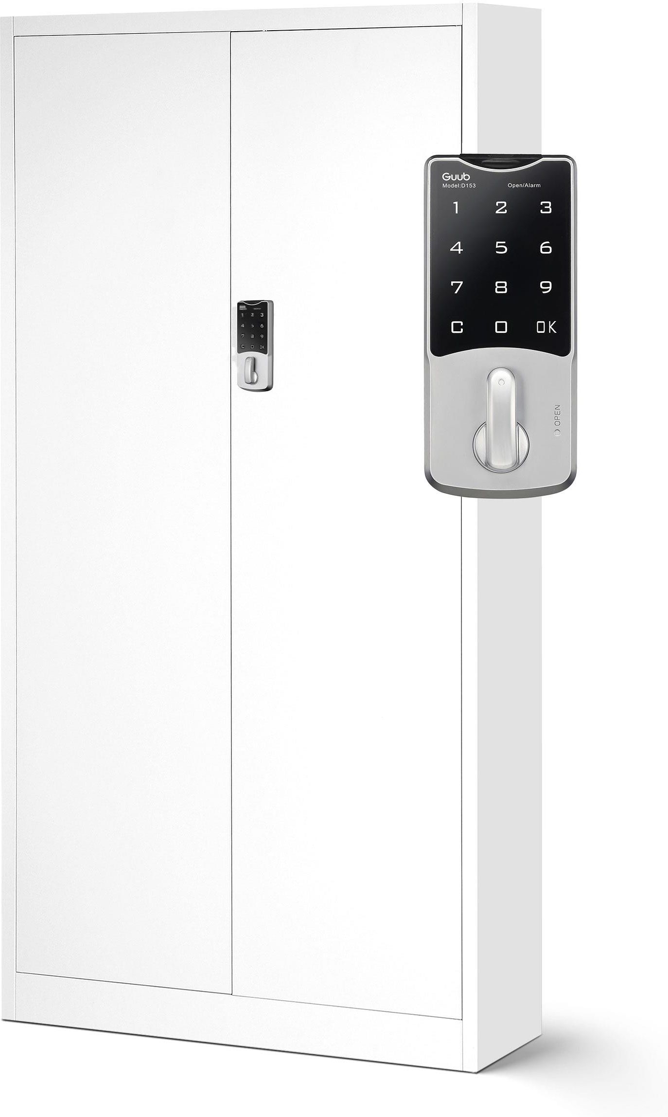 Biurowa szafa metalowa na akta DANIEL, 900 x 1850 x 400 mm, biała Zamykana na szyfr szafa DANIEL to jedyny w swoim rodzaju produkt do wszechstronnego zastosowania. Spełnia wymogi RODO 2018 i ze względu na nowoczesny elektroniczny zamek świetnie nadaje się do przechowywania dokumentów, ale jest …