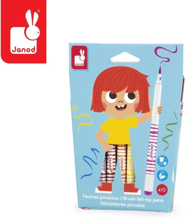 Zestaw 10 flamastrów pędzelkowych francuskiej marki JANOD w pięknych, intensywnych kolorach. Są poręczne, z okrągłymi uchwytami. Mają mięciutką filcową końcówkę, przypominającą pędzelek i długie zatyczki. Zapakowane w estetyczne kartonowe pudełko z dziecięcą grafiką. Zestaw zaprojektowano we …