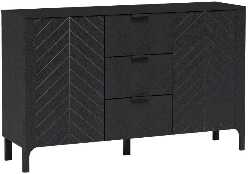 Nowoczesna, czarna komoda z eleganckim wzorem w jodełkę. Posiada trzy szuflady i dwie szafki z półkami, oferując dużo miejsca do przechowywania. Smukłe nóżki dodają lekkości, a trwałe materiały gwarantują wytrzymałość. Idealna do salonu, sypialni i przedpokoju