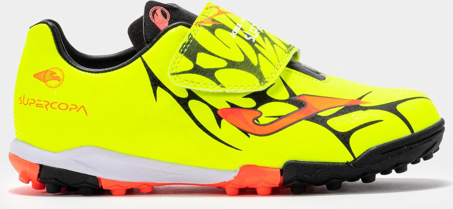 Buty Joma Super Copa 2509 TF Jr Właściwości buty marki Joma do gry w piłkę nożną na sztucznej murawie niski model buty zapinane na rzep cholewka wykonana ze skóry syntetycznej tekstylna wyściółka niebrudząca podeszwa technologia Durability logo producentadla chłopców Kolor żółty