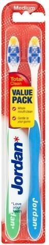 Jordan Total Clean szczoteczka do zębów Średnia 2szt. (P1) 7038516140395 Jordan Total Clean to szczoteczka nowej generacji w atrakcyjnej cenie:* charakteryzuje się wyprofilowanym włosiem, dzięki czemu dokładnie czyści nawet trudno dostępne miejsca* ergonomiczna rączka pozwala na pewny uchwyt* dodatkowo posiada czyścik do języka
