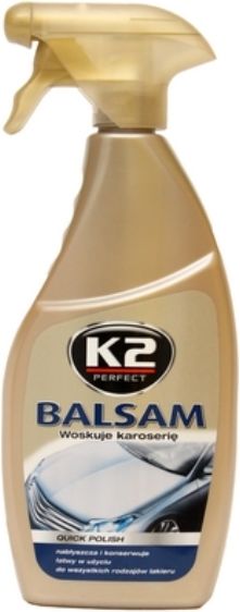 K2 BALSAM 700ml K010 Woskuje karoserię NABŁYSzCzA I KONSERWUJE: Pozwala szybko i skutecznie uzyskać intensywny połysk lakieru. Przywraca jego naturalny głęboki kolor, by lakier znów wyglądał jak nowy. zabezpiecza lakier przed szkodliwym wpływem warunków stmosferycznych. ŁATWY W UŻYCIU: Nowy atomizer pozwala na stosowanie BALSAMU w każdej pozycji, także do góry dnem, co dodatkowo ułatwia jego aplikację. Dzięki płynnej formule z łatwością rozprowadza się na powierzchni karoserii. DO WSzYSTKICH RODzAJÓW LAKIERU: Może być stosowany zarówno na lakierach zwykłych, jak i metalizowanych. Szczególnie zalecany do nowych, dobrze utrzymanych lakierów. SPOSÓB UŻYCIA: Przed użyciem wstrząsnąć. Nanieść produkt przy pomocy miękkiej szmatki na umytą wcześniej (najlepiej przy pomocy specjalnego szamponu K2 Express) i suchą karoserię. Następnie poerować powierzchnię, aż do uzyskania połysk. UWAGA: Nie stosować na rozgrzany lakier. Chronić przed mrozem.