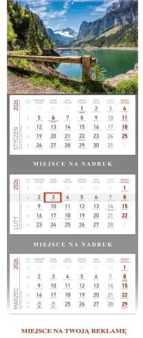 Kalendarz 2026 trójdzielny ścienny WOKÓŁ NAS Górskie Jezioro [KS055B] Elegancki kalendarz wiszący ścienny w układzie trzymiesięcznym, wyposażony w ozdobną główkę o wypukłej strukturze, uszlachetnioną lakierem UV. Składany do formatu A4, co ułatwia transport i przechowywanie. Dostępny w czterech kolorach plecków: zielonym, bordowym, granatowym i szarym, oraz z ośmioma wzorami główki. Umożliwia wykonanie nadruku reklamowego zarówno pomiędzy kalendariami, jak i w dolnej części kalendarza. Istnieje także możliwość realizacji wersji z główką i pleckami według indywidualnego projektu. Kalendarium składa się z trzech bloczków po 12 kart każdy, drukowanych na białym papierze o gramaturze 70 g/m², w formacie 134 x 282 mm. Plecki wykonane są z kartonu o gramaturze 300 g/m² i wymiarach 566 x 295 mm, natomiast główka z papieru kredowego 150 g/m² o wymiarach 210 x 295 mm, wypełniona tekturą falistą dla uzyskania efektu wypukłości. Kalendarz pakowany jest pojedynczo w woreczki foliowe. typ: kalendarz wiszący trójdzielny układ: trzymiesięczny format całkowity: 776 x 295 mm plecki: zielone, bordowe, granatowe, szare główka: Górskie Jezioro kalendarium: 3 x 12 kart, biały papier 70 g/m², wymiary 134 x 282 mm plecki: karton 300 g/m², wymiary 566 x 295 mm główka: papier kredowy 150 g/m², wymiary 210 x 295 mm, lakier UV, wypełnienie z tektury falistej możliwość nadruku reklamowego pomiędzy kalendariami i na dole kalendarza pakowanie: pojedynczo w woreczki foliowe