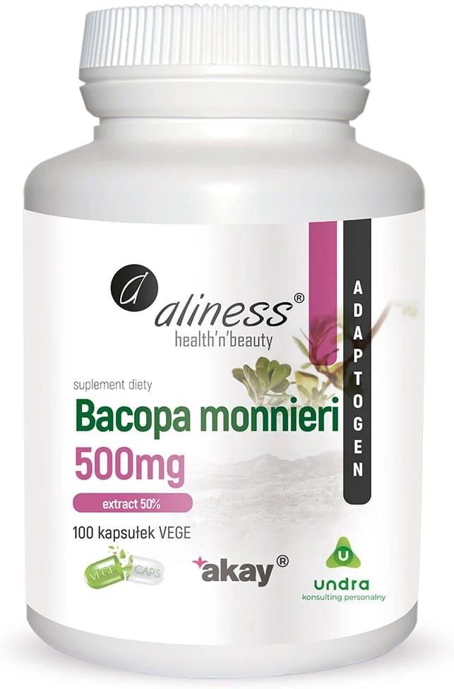 Zestaw Aliness Bacopa Monnieri extract 50%, 500 mg 100 kapsułek roślinnych + Natural Ashwaganda 580 mg 9% 100 Vege kapsułek Adaptogen Odporność na stres Koncentracja Pamięć BAKOPA DROBNOLISTNA (BACOPA MONNIERI) 500mg extract 50% Aliness 100 kapsułek VEGE suplement diety Zalety Wspomaga centralny …