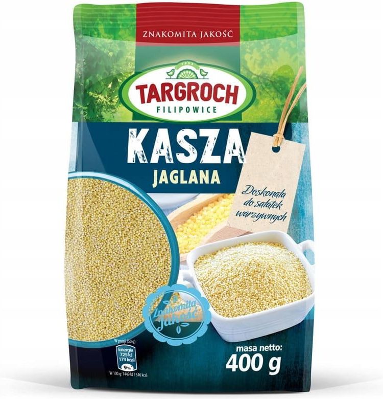 Kasza Jaglana 400 g Targroch Kasza jaglana to smaczny i wartościowy produkt, który może być wykorzystywany w różnych potrawach. Oto więcej informacji na jej temat: Zastosowanie: Kasza jaglana jest wszechstronnym składnikiem, który może zastąpić ziemniaki czy ryż w wielu daniach. Może być również połączona z owocami, co po ugotowaniu tworzy smaczne i pożywne śniadanie. Ze względu na swoją neutralność w smaku, kasza jaglana może być używana zarówno w potrawach słodkich, jak i słonych. Wartości odżywcze: Kasza jaglana jest bogatym źródłem składników odżywczych, w tym witamin i minerałów, które mogą korzystnie wpłynąć na zdrowie organizmu. Wartości odżywcze kaszy jaglanej obejmują: Witamina B1, B2 i B6: Te witaminy są istotne dla funkcjonowania układu nerwowego, pracy mięśni i serca. B2 pomaga w utrzymaniu zdrowego układu nerwowego i odpornościowego, a B6 jest niezbędna do produkcji hemoglobiny i regulacji ciśnienia krwi. Witamina E: Pomaga w zachowaniu płodności, opóźnia procesy starzenia się skóry i działa jako antyoksydant. Miedź: Jest ważna dla zębów i kości, uczestniczy w produkcji pigmentów w skórze, włosach i oczach, oraz wspiera system nerwowy i produkcję czerwonych krwinek. Żelazo: Jest kluczowe dla transportu tlenu w organizmie, zapobiega anemii i uczestniczy w produkcji serotoniny, co może pomóc w ochronie przed depresją. Fosfor: Wspomaga zdrowie kości i zębów, a także buduje wiele komórek w organizmie. Kasza jaglana, jako produkt o różnorodnych wartościach odżywczych, może być wartościowym dodatkiem do zrównoważonej diety. Ciekawostki: Kasza jaglana jest zalecana dla kobiet w ciąży oraz w okresie menopauzy. Składniki: 100% Kasza jaglana Kraj Pochodzenia: Polska
