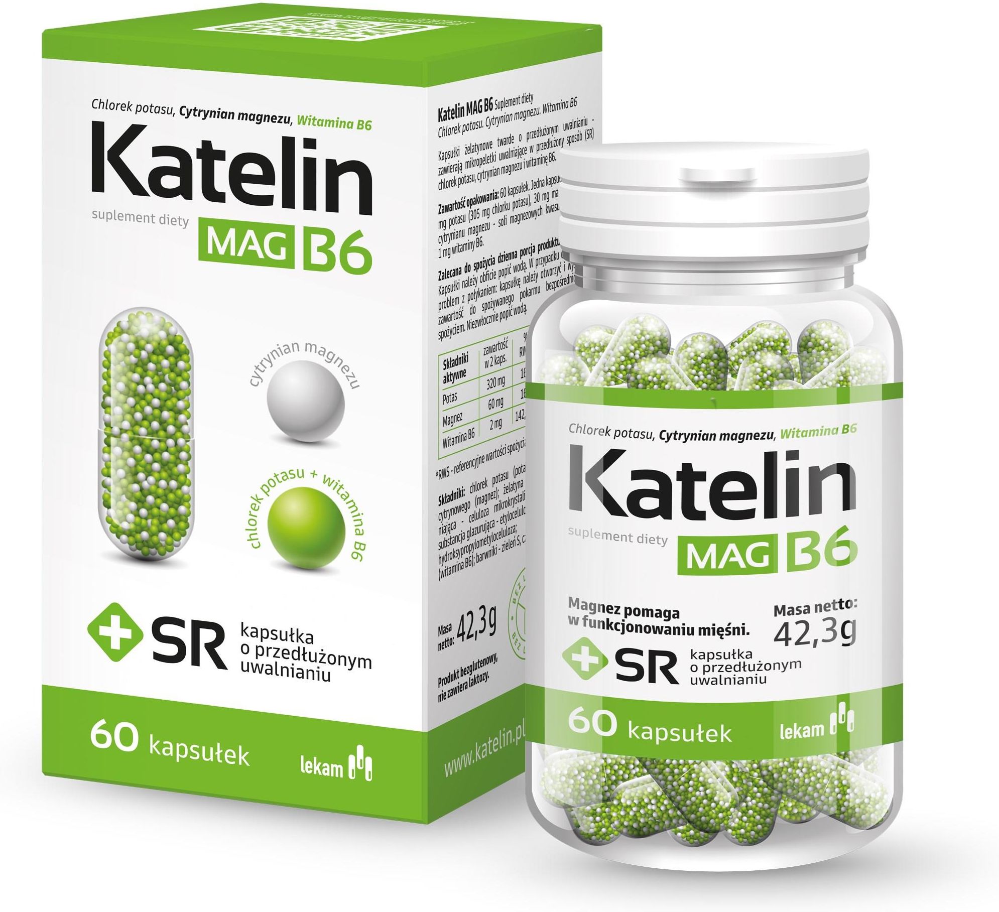 Katelin MAG B6 60 kapsułek Katelin MAG B6 - suplement w postaci kapsułek SR, zawierających mikropeletki uwalniające w przedłużony sposób chlorek potasu, cytrynian magnezu i witaminę B6. Zawarty w suplemencie potas pomaga w utrzymaniu prawidłowego ciśnienia krwi oraz funkcjonowania układu nerwowego i mięśni. Magnez wspiera utrzymanie zdrowych i mocnych kości oraz zębów, a także wspomaga równowagę elektrolitową oraz prawidłowe funkcje psychologiczne. Witamina B6 wspiera produkcję prawidłowej ilości czerwonych krwinek i zapewnia wsparcie układu odpornościowego.  Składniki chlorek potasu (potas); sole magnezowe kwasu cytrynowego (magnez); żelatyna wołowa; substancja wypełniająca - celuloza mikrokrystaliczna; skrobia kukurydziana; substancja glazurująca - etyloceluloza; substancja zagęszczająca - hydroksypropylometyloceluloza; chlorowodorek pirydoksyny (witamina B6); barwniki - zieleń S, czerń brylantowa PN. table.katelinTable { width: 100%; text-align: left; border-collapse: collapse; } table.katelinTable td, table.katelinTable th { border: 1px solid #AAAAAA; padding: 5px 13px; } table.katelinTable tbody td { font-size: 18px; } table.katelinTable tfoot td { font-size: 14px; } table.katelinTable tfoot .links { text-align: right; } table.katelinTable tfoot .links a{ display: inline-block; background: #1C6EA4; color: #FFFFFF; padding: 2px 8px; border-radius: 5px; } Składniki Zawartość w 2 kapsułkach %RWS* Zawartość w 3 kapsułkach %RWS* Potas 320 mg 16% 480 mg 24% Magnez 60 mg 16% 90 mg 24% Witamina B6 2 mg 142,85% 3 mg 214,28% *RWS - referencyjne wartości spożycia dla osób dorosłych Produkt bezglutenowy, nie zawiera laktozy. Masa netto 42,3 g Właściwości składników Potas pomaga w utrzymaniu prawidłowego ciśnienia krwi, wspomaga prawidłowe funkcjonowanie układu nerwowego i mięśni. Magnez przyczynia się do zmniejszenia uczucia zmęczenia i znużenia, pomaga w prawidłowym funkcjonowaniu mięśni, wspomaga prawidłowe funkcjonowanie układu nerwowego, pomaga w utrzymaniu zdrowych kości i zębów, wspomaga utrzymanie równowagi elektrolitowej oraz pomaga w utrzymaniu prawidłowych funkcji psychologicznych. Witamina B6 pomaga w prawidłowej produkcji czerwonych krwinek, przyczynia się do zmniejszenia uczucia zmęczenia i znużenia, wspomaga prawidłowe funkcjonowanie układu odpornościowego i nerwowego oraz pomaga w utrzymaniu prawidłowych funkcji psychologicznych. Produkt przeznaczony do stosowania w celu uzupełniania normalnej diety w potas, magnez i witaminę B6. Szczególnie polecany osobom dbającym o prawidłowe ciśnienie krwi oraz prawidłowe funkcjonowanie układu nerwowego i mięśni. Zalecane dzienne spożycie 2-3 kapsułki dziennie. Kapsułki należy obficie popić wodą. Ostrzeżenia dotyczące bezpieczeństwa Ostrzeżenie: Nie stosować w przypadku nadwrażliwości lub  uczulenia na którykolwiek ze składników preparatu. Produkt przeznaczony dla osób dorosłych. Nie zaleca się stosowania preparatu kobietom w ciąży i karmiącym piersią. Nie należy przekraczać porcji zalecanej do spożycia w ciągu dnia. Suplementy  diety nie mogą być stosowane jako substytut zróżnicowanej diety.  Należy brać pod uwagę ilości potasu i magnezu przyjmowanych  z innych źródeł. Ważny jest zrównoważony sposób żywienia  i zdrowy tryb życia.  Spożycie 2-3 kapsułek dziennie zgodnie z instrukcją spożycia  zapewnia deklarowane korzyści dla zdrowia. Podmiot odpowiedzialny Przedsiębiorstwo Farmaceutyczne LEK-AM Sp. z o.o. Ostrzykowizna 14A 05-170 Zakroczym Producent For-med Sp. z o.o. ul. Osowska 85/2 04-351 Warszawa