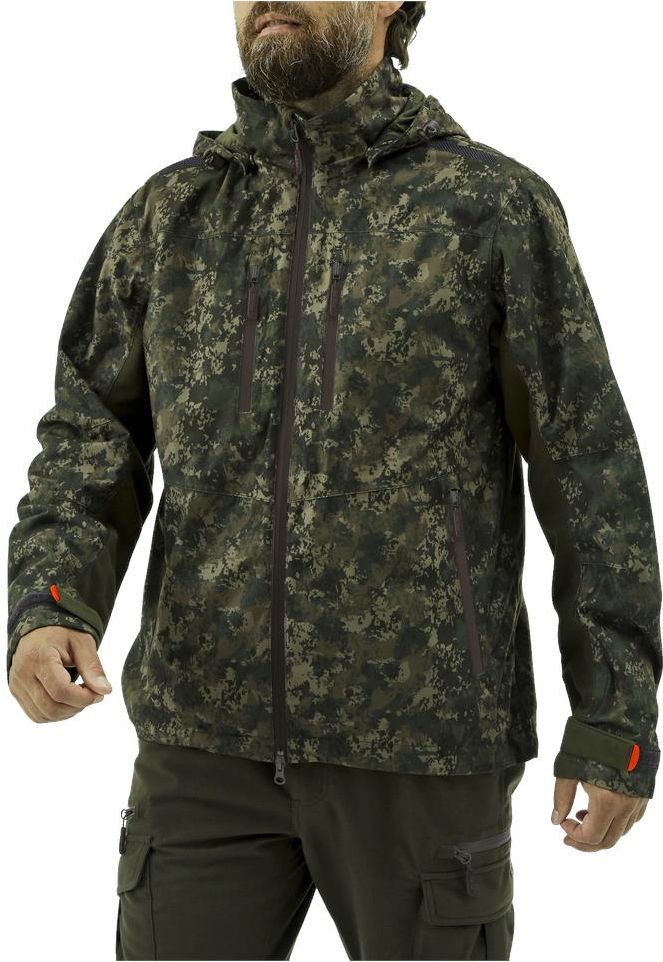 Kurtka myśliwska wykonana z cichego, miękkiego materiału z wzorem maskującym oraz wiatro- i wodoodporną membraną. Dwie zapinane kieszenie na krótkofalówkę z uchwytem na naboje i kieszonką na telefon. Otwory wentylacyjne pod pachami.