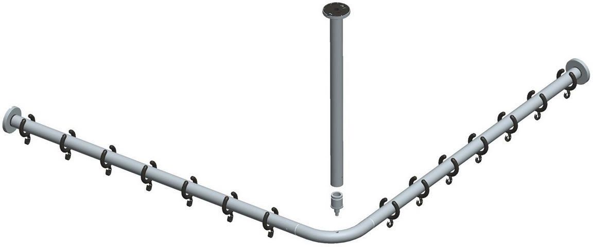 Dla brodzików kwadratowych 800 x 800 mm Kompletny, zawiera: 3 x zestaw montażowy naścienny 2 x drążek do zasłon prysznicowych 700 mm 1 x element łączeniowy 90° dla brodzików kwadratowych 1 x wspornik sufitowy 400 mm 2 x pierścienie na zasłonkę, białe (1 zestaw zawiera 10 sztuk) 1 x element połączeniowy