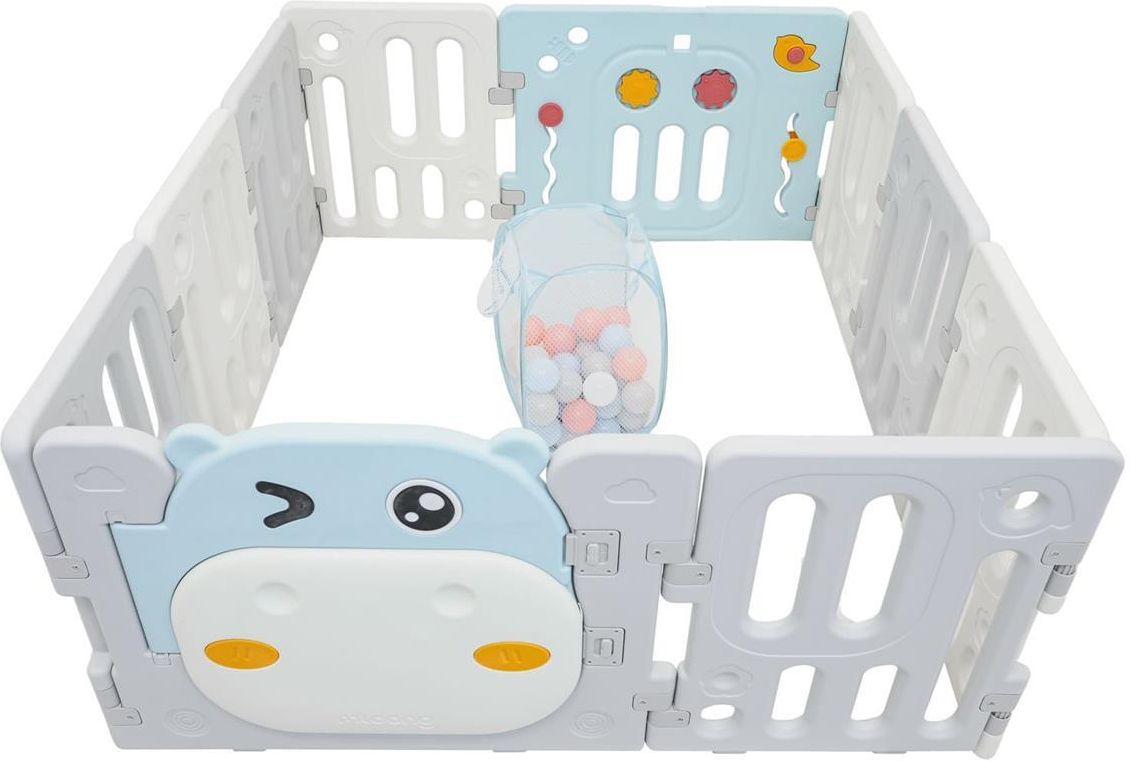 Opis Kojec Modułowy Hipcio Niebieski Duży, praktyczny, składany kojec modułowy dla dziecka od-6 go miesiąca życia. Z kojca możemy ułożyć dowolną konstrukcję, według własnych upodobań, bardzo łatwo się składa i rozkłada, jest stabilny i posiada gładkie krawędzie. Wnętrze kojca wyposażono w manipulacyjne elementy takie jak przesuwane kółeczko, zębatki, piszczałkę czy kierownicę. Zestaw wykonano z trwałych i nietoksycznych materiałów, składa się z 10 paneli. Panel drzwi blokuje się, na zewnątrz uniemożliwiając otwarcie drzwi przez dziecko. Antypoślizgowe nóżki zapobiegają przesuwaniu się kojca. W kojcu twój maluszek będzie mieć wystarczającą ilość miejsca do swobodnego przemieszczania się, a jednocześnie będzie bezpieczny. W zestawie znajduje się również kosz na piłeczki i 40 piłeczek. Funkcje zestawu: - odpowiedni dla dzieci powyżej 6-go miesiąca życia, - możliwość zbudowania dowolnej wielkości kojca według własnych upodobań, - elementy manipulacyjne wewnątrz kojca: przesuwane kółeczka, zębatki, piszczałka w ptaszku i kierownicy, obrotowa kierownica. - wykonany z trwałych i nietoksycznych materiałów, - blokada drzwi na zewnątrz, - antypoślizgowe nóżki, - łatwo się składa i rozkłada, - kosz na piłeczki i piłeczki w zestawie. Wymiary - kojec ok. 128 cm x 150 cm x 63 cm, - kosz na piłeczki ok. 47 cm x 29 cm x 24 cm, - średnica piłeczki ok. 7,5 cm, - opakowanie ok. 106,5 cm x 67,5 cm x 26,5 cm. Zawartość zestawu - 10 paneli kojca, - 40 piłeczek, - instrukcja montażu