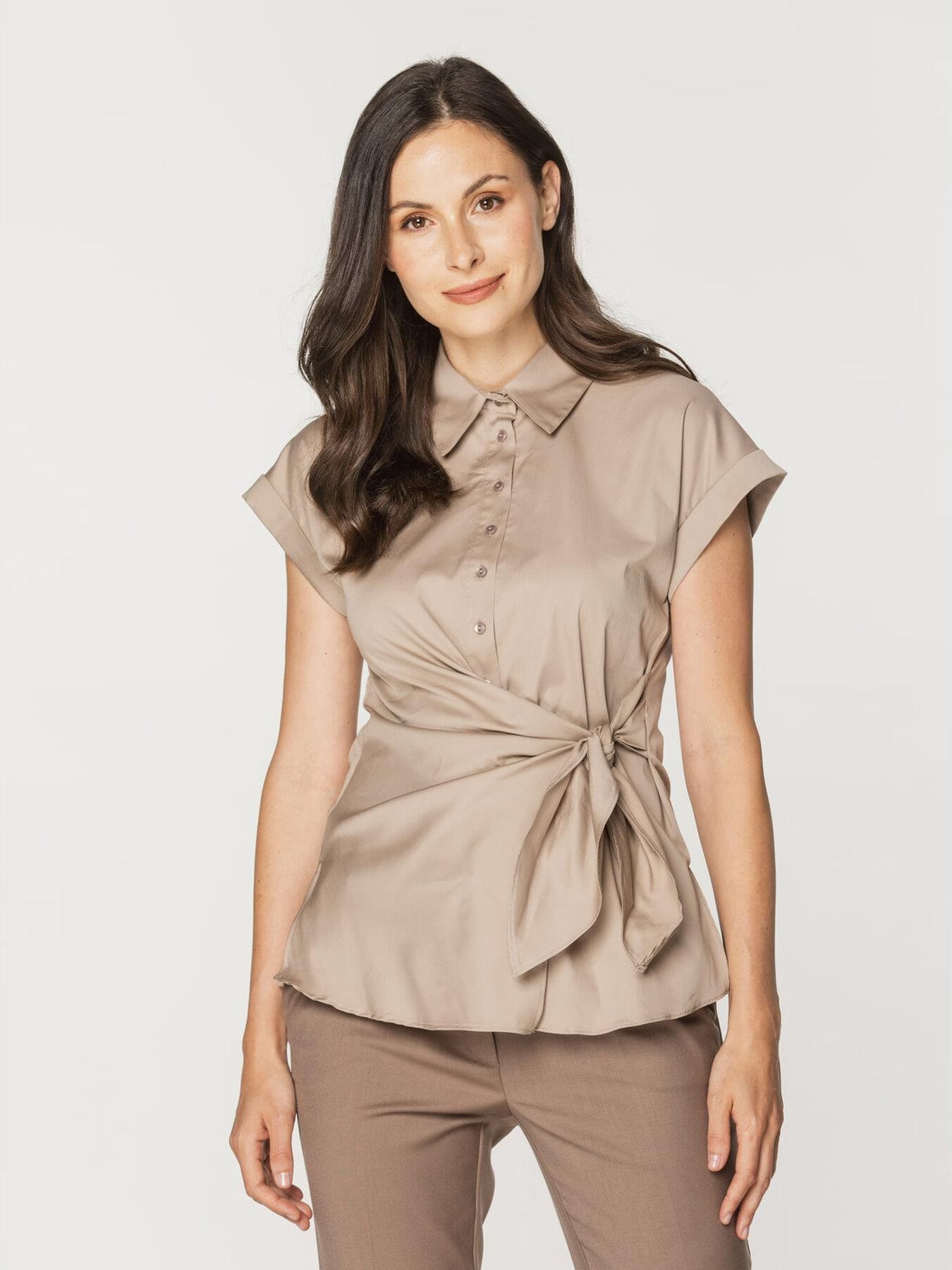 Beżowa koszula damska z krótkim rękawem, klasycznym kołnierzykiem i stylowym wiązaniem w talii