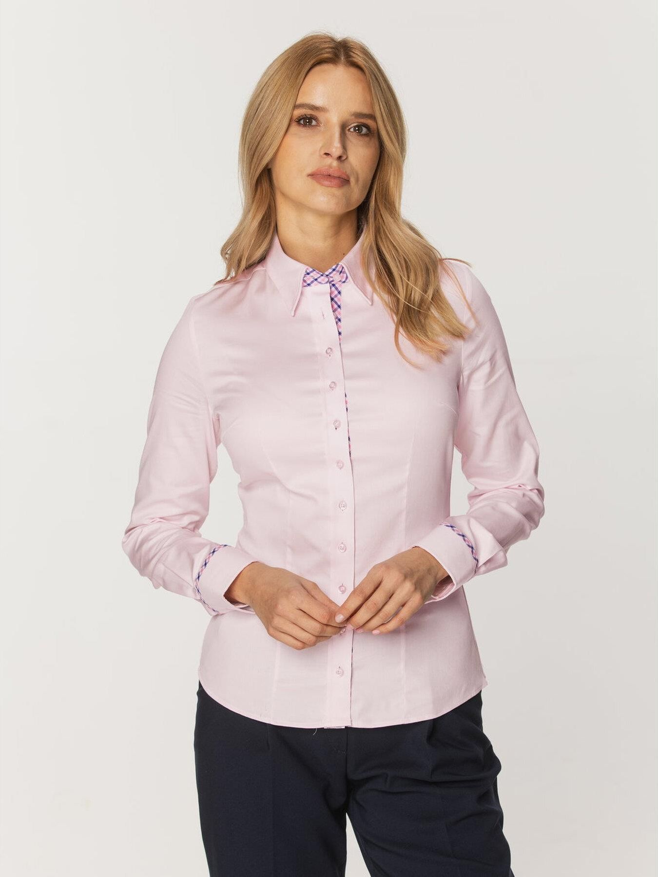 Jasnoróżowa, taliowana koszula damska z krytym podpinanym kołnierzykiem i kontrastami w kratkę, tkanina z dodatkiem elastanu