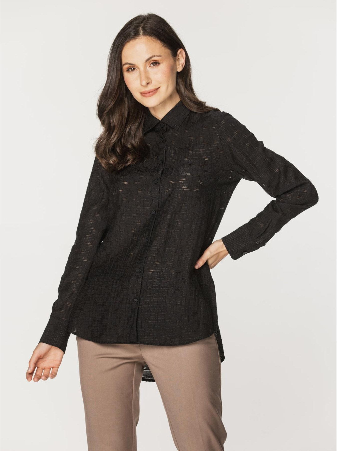 Czarna, żakardowa koszula damska o prostym kroju z klasycznym kołnierzykiem