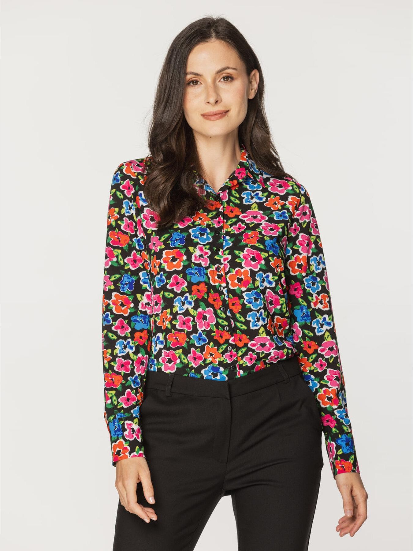 Czarna, satynowa koszula damska o prostym kroju w kolorowe kwiaty z klasycznym, miękkim kołnierzykiem i gładkiej, lejącej fakturze
