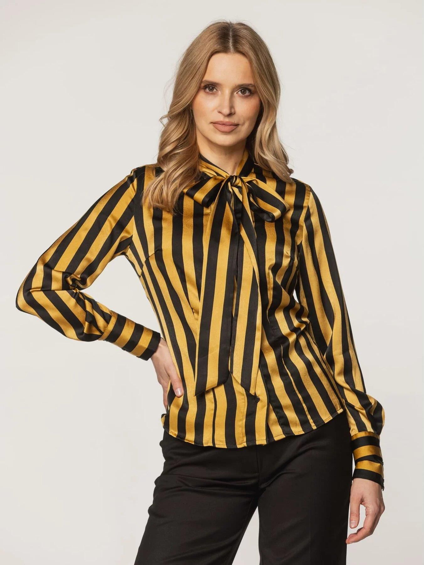 Koszula damska o prostym kroju w czarne i złote paski z kołnierzykiem zawiązywanym w długą kokardę