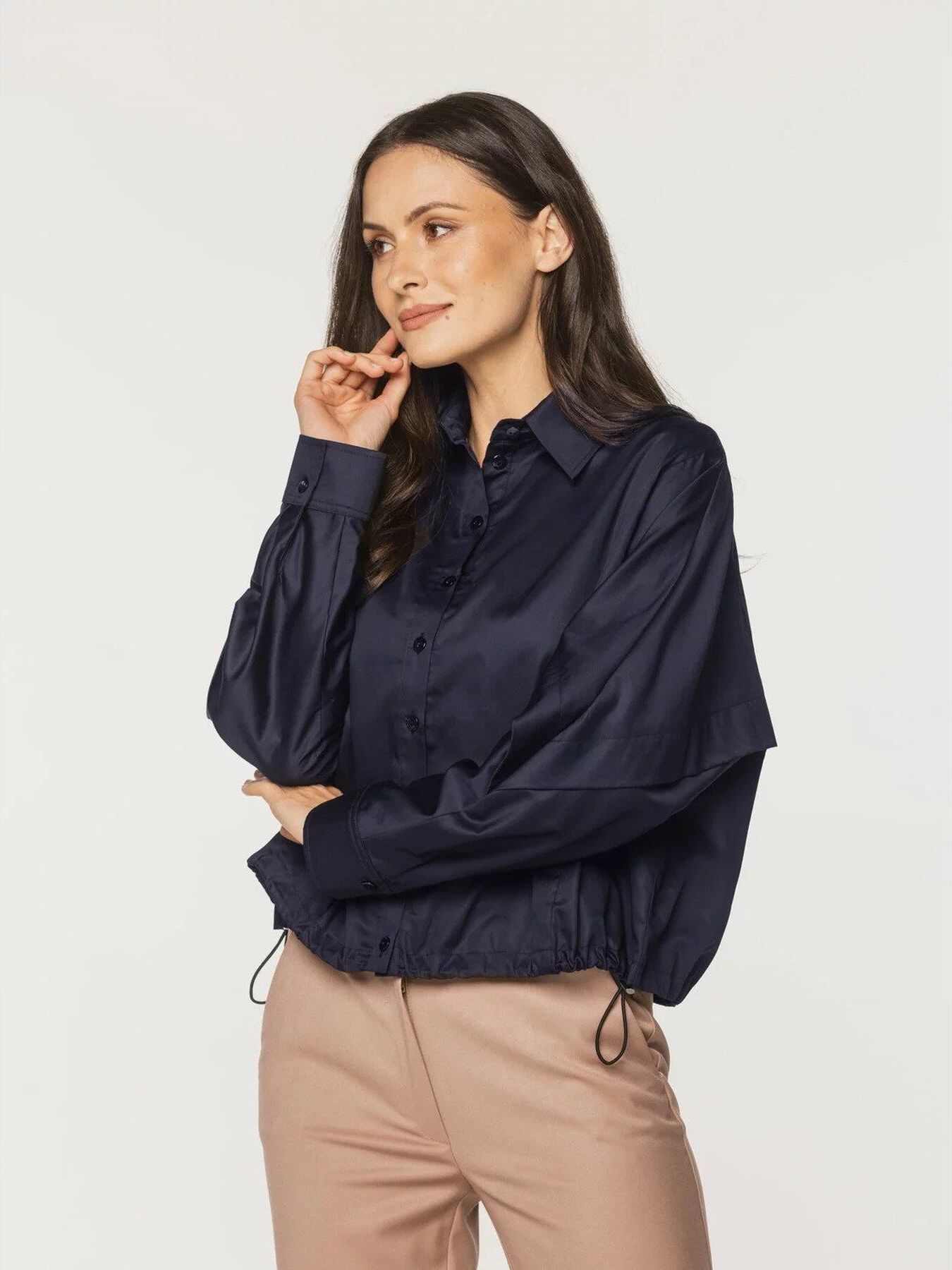 Ciemnogranatowa, krótka koszula damska o luźnym kroju i gładkiej fakturze z klasycznym kołnierzykiem i gumką