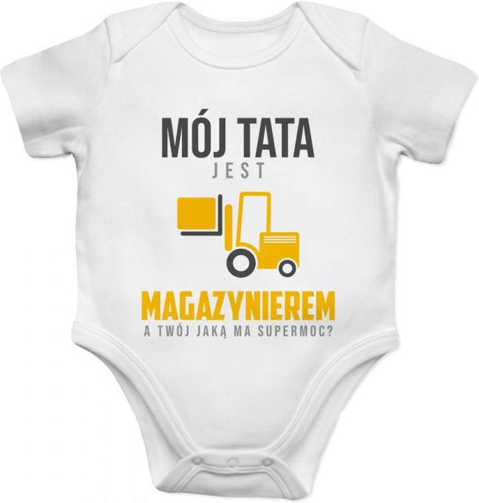 Mój tata jest magazynierem, a Twój jaką ma supermoc? Body niemowlęce z nadrukiem. Wykonane w 100% z bawełny z nadrukiem przystosowanym do kontaktu ze skórą dziecka. Bezproblemowe ubieranie dzięki dwóm guzikom na ramieniu.