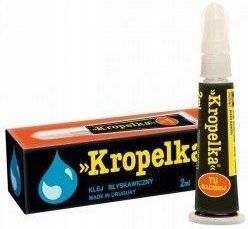 Klej błyskawiczny Kropelka 2 ml Kropelka jest klejem błyskawicznym, łatwym w użyciu, służącym do drobnych napraw w domu. Skleja w kilka sekund praktycznie każdego rodzaju materiały, a zwłaszcza palce. Używa się go do napraw w domu, podczas wykonywania hobby, przy pracach rękodzielniczych i ogólnie przy różnego rodzaju czynnościach praktycznych. Kropelka Żel to rozwiązanie do trwałych napraw przedmiotów wymagających większej precyzji, estetyki łączenia lub wypełnienia ubytków. Można poprawiać łączenie. Nie rozlewa się.