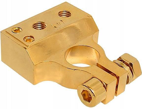 Klema do akumulatorów samochodowych, plusowa (+) 4GAx2 + 8GAx2 (6343) Zestaw przeznaczony jest do montażu akumulatorów samochodowych 6V i 12V. Montaż nie wymaga lutowania, wystarczy włożyć przewód do wnęki i dokręcić śrubami. Gniazda: 2x 4GA (max 25mm2) 2x 8GA (max 10mm2)