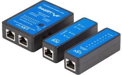 Tester kabli LAN POE RJ-45,RJ-11 NT-0404 Tester LAN i PoE może z łatwością sprawdzić właściwą konfigurację pin-ów kabli 10Base-T, 10Base-2, modularnych kabli RJ45/RJ11, 258A, TIA-568A/568B oraz kabli Token Ring. Produkt działa na zasadzie porównania obu końców okablowania źródłowego oraz odbierającego sygnał. Dzięki zdalnemu modułowi użytkownik może sprawdzić działanie kabli, których drugi koniec znajduje się daleko i kończy się na gnieździe natynkowym lub na patch panelu.Za pomocą tego urządzenia łatwo możemy sprawdzić ciągłość kabli oraz wykryć problemy z transmisją takie jak: spięcie, niepoprawny układ par / żył czy odwrotne podłączenie żył do pin-ów. Produkt umożliwia: Sprawdzenie poprawnej konfiguracji pin-ów kabli Ethernet 10Base-T, 10Base-2, modularnych kabli RJ45/RJ11, 258A, TIA 568A/568B oraz kabli Token Ring. Weryfikację statusu testu danego kabla oraz potwierdzenie jego poprawnego działania (ciągłości) i wykrycie problemów takich jak: spięcie, niepoprawny układ par / żył czy odwrotnie podłączenie żył do pin-ów. Testowanie kabli, których drugi koniec znajduję się daleko i kończy się na gnieździe natynkowym lub na patch panelu. Kontrolę uziemienia. Wybór trybu skanowania automatyczny lub ręczny (manualny). Działanie za pomocą baterii 9V (brak w zestawie wymagany zakup). Informacje o produkcie Testowane media Pojedyńcze pary Lokalizator kabli Nie Złącza BNC Zasilanie Bateria 9V Akcesoria w zestawie 1 x Moduł główny testera LAN 1 x Moduł zdalny (terminator) testera LAN 2 x Adapter do kabli BNC 1 x Adapter BNC M/M 3 x Adapter RJ-45 na RJ-11 1 x Instrukcja obsługi Kolor (wyliczeniowy) Niebieski