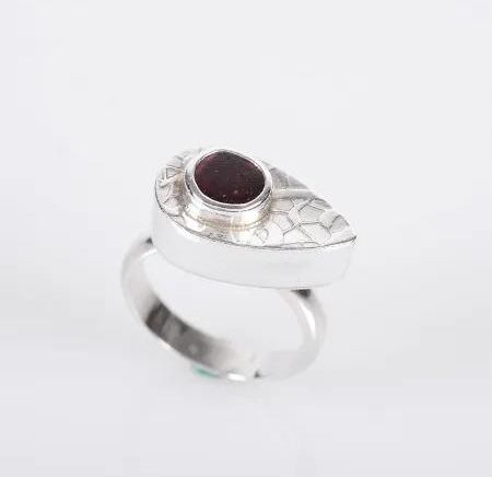 Pierścionek w kształcie łezki, wykonany z ręcznie fakturowanego, matowego i częściowo polerowanego srebra. Pierścionek zdobi oczko z przejrzystego granatu. Granat uznawany jest za talizman miłości, odwagi i amulet ochronny. To kamień sukcesu i siły. Jest motorem wszelkich działań gwarantując …