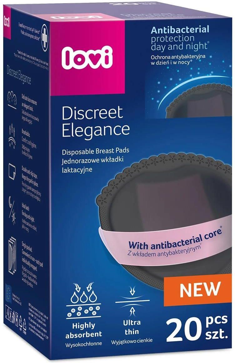 Jednorazowe wkładki laktacyjne DISCREET ELEGANCE Wkładki laktacyjne LOVI Discreet Elegance zapewniają ochronę antybakteryjną dla mamy i dla jej dziecka. Specjalny wkład antybakteryjny, z dodatkiem nano-srebra eliminuje określone bakterie i chroni skórę piersi przed ich działaniem *, co daje jeszcze większą higienę i bezpieczeństwo podczas karmienia. Antybakteryjne wkładki są wysokochłonne, wkład żelujący wchłania wilgoć i utrzymuje ją z dala od skóry, zapewniając uczucie suchości zarówno w dzień, jak i w nocy. Oddychająca struktura, umożliwia swobodny przepływ powietrza, dzięki czemu wrażliwa skóra piersi nie jest narażona na odparzenia. Wkładki z dodatkiem antybakteryjnym są wyjątkowe cienkie i odpowiednio wyprofilowane, wykończone elegancką koronką, więc idealnie dopasowują się do kształtu piersi. Dzięki podwójnemu paskowi samoprzylepnemu wkładka nie przesuwa się wewnątrz biustonosza. Każda wkładka jest pakowana indywidualnie, dla maksymalnej higieny. *Różowy element wkładki posiada właściwości antybakteryjne, jego współczynnik hamujący dla bakterii gronkowca złocistego, E.coli oraz drożdżaka Candida albicans wynosi co najmniej 90% co jest potwierdzone na bazie raportu SGS-CSTC Standards Technical Services (Shanghai) Co., Ltd. antybakteryjne: chronią skórę piersi przed działaniem określonych bakterii* wysokochłonne: doskonale zatrzymują wilgoć wyjątkowo cienkie – tylko 1 mm wygodne: posiadają profilowany kształt oddychające: swobodnie przepuszczają powietrze delikatne dla skóry pakowane oddzielnie dla maksymalnej higieny Jednorazowe wkładki laktacyjne - zapewniają uczucie suchości, zarówno w dzień jak i w nocy. Ochrona antybakteryjna dla mamy i dziecka - specjalny wkład antybakteryjny, z dodatkiem nano-srebra eliminuje określone bakterie i chroni skórę piersi przed ich działaniem * Wysokochłonne - wkład żelujący zatrzymuje wilgoć wewnątrz wkładki nawet do 100 ml, zapewniając uczucie suchości i komfortu. Oddychające - swobodnie przepuszczają powietrze, dzięki czemu skóra piersi nie jest narażona na odparzenia. Dyskretne - wyjątkowo cienkie, tylko 1 mm, dzięki czemu są niewidoczne pod bielizną Podwójny pasek samoprzylepny – utrzymuje wkładkę na miejscu, zapobiega przesuwaniu się jej wewnątrz biustonosza. Wyprofilowane - doskonale dopasowują się do kształtu piersi. Pojedynczo zapakowane - każda wkładka pakowana jest osobno w szczelną torebkę, dla maksymalnej higieny. W zestawie profilowane wkładki laktacyjne z wkładem żelującym, kolor: czarny, ilość: 20 szt.