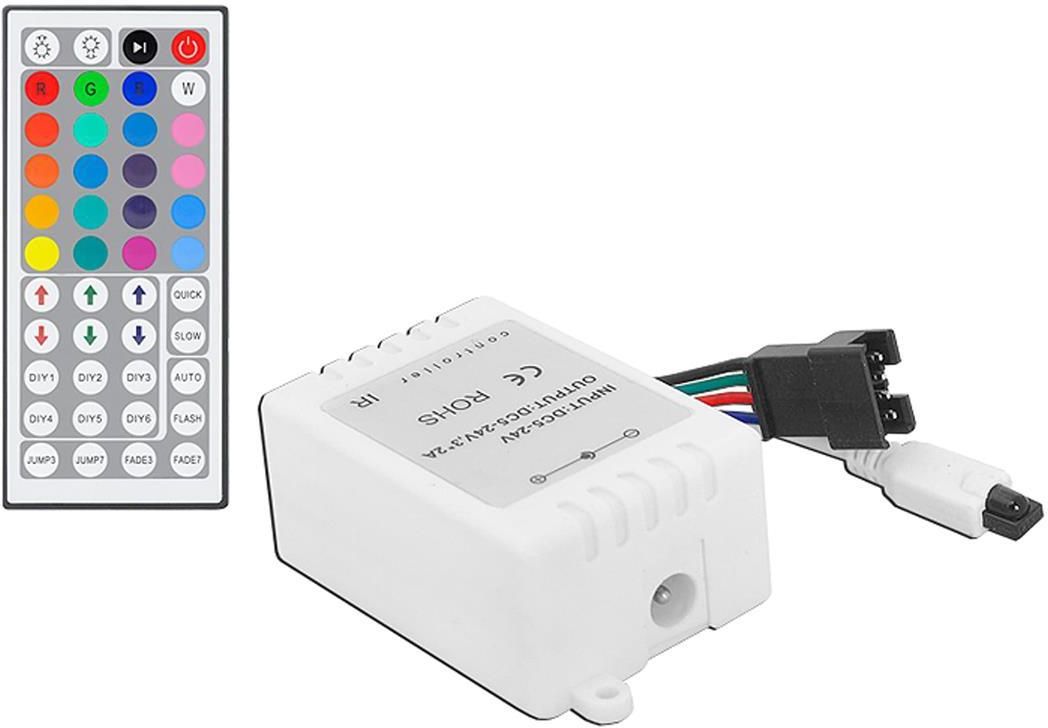 Sterownik do taśm LED RGB IR 3x2A ze ściemniaczem + pilot / LxTRF76 Sterownik, 44 przyciski, czarny, RGB (3 kanały), podwójne PCB. Napięcie zasilania 5 - 24 VDC Napięcie wyjściowe 5 - 24 VDC Maksymalne obciążenie 3 x 2 A Sterownik RGB umożliwia zdalną kontrolę oświetlenia RGB takiego jak: taśmy i listwy LED RGB, halogeny RGB. Za pomocą kontrolera można również sterować trzema różnymi obwodami jednokolorowymi. Sterownik do taśm RGB pracujący w technologii IR. Sterowanie pracą kontrolera odbywa się za pomocą pilota na podczerwień. Urządzenie stosuje się w zaawansowanych systemach oświetleniowych nowoczesnych lokali, domów, klubów itp. Doskonale nadaje się do podświetlania reklam, estrad, wystaw sklepowych, mebli, tworzenia akcentów świetlnych. Dodatkową funkcją jest możliwość definiowania własnych kolorów i odcieni. Montaż i podłączenie jest proste i intuicyjne. Niewielkie rozmiary sterownika, pozwalają ukryć go w miejscu całkowicie niewidocznym, co znacznie zwiększa estetykę wnętrza. Zaawansowana technologia, wysokiej jakości materiały oraz duża precyzja wykonania gwarantują długą, bezawaryjną pracę urządzenia oraz satysfakcje i bezpieczeństwo użytkownika.
