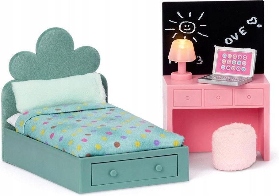 Fajne łóżko w modnym kolorze, puf i biurko doskonale wyposaży pokój dla nastolatka w domku dla lalek marki Lundby. Oczywiście bez świecącej lampki, laptopa do grania, słuchania muzyki lub rozmów z przyjaciółmi i tablicy do pisania wesołych wiadomości nie byłoby zabawy, więc są również w zestawie! …