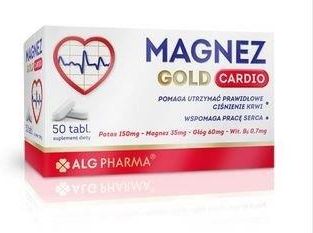 ALG PHARMA MAGNEZ GOLD CARDIO B6 - 2x50 TABLETEK ZESTAW Magnez Gold Cardio to suplement diety zawierający 150 mg potasu, 35 mg magnezu w postaci soli magnezowych kwasu cytrynowego oraz 60 mg głogu w jednej tabletce. Magnez oraz witamina B6 wspomagają prawidłowy metabolizm energetyczny oraz funkcjonowanie układu nerwowego. Przyczyniają się do zmniejszenia uczucia przemęczenia i ogólnego znużenia organizmu. Wspierają pracę układu mięśniowego oraz odpornościowego. Potas wspomaga prawidłowe funkcjonowanie układu nerwowego oraz mięśniowego. Wyciąg z głogu ma pozytywny wpływ na wydajność układu krążenia, pracę serca. Cytrynian magnezu jest związkiem organicznym zapewniającym dobre przyswajanie magnezu. Niedobory magnezu mogą objawiać się szeregiem zaburzeń nerwowo-mięśniowych, przy czym charakterystyczne są skurcze mięśni (np. łydek, zwłaszcza w nocy), drżenie powieki bądź górnej wargi, mrowienie lub drętwienie palców, a także zaburzenia rytmu serca, nieprawidłowe ciśnienie tętnicze, uczucie zmęczenia i znużenia. Informacja żywieniowa 2 tabletki Potas: 300 mg, 15% Magnez: 70 mg, 19% Wyciąg z głogu: 120 mg Witamina B6: 1,4 mg, 100% *RWS – Referencyjna Wartość Spożycia Składniki: substancja wypełniająca – celuloza, chlorek potasu, sole magnezowe kwasu cytrynowego (magnez), wyciąg z głogu, substancje przeciwzbrylające sole magnezowe kwasów tłuszczowych, dwutlenek krzemu, chlorowodorek pirydoksyny (witamina B6), substancja glazurująca: hydroksypropylometyloceluloza, substancja wypełniająca: polidekstroza, barwnik: dwutlenek tytanu, substancja glazurująca: glikol polietylenowy, substancja przeciwzbrylająca: talk. Przeznaczenie: preparat przeznaczony jest dla osób dorosłych. Przechowywanie: należy przechowywać w suchym miejscu, w temperaturze pokojowej w sposób niedostępny dla małych dzieci Zalecane spożycie: dorośli 1 tabletka 2 razy dziennie. Korzystny efekt można zaobserwować już w przypadku codziennego spożywania 1 tabletki Magnez Gold Cardio. Ostrzeżenia: nie należy przekraczać zalecanej do spożycia porcji w ciągu dnia. Suplement diety nie może być stosowany jako substytut (zamiennik) zróżnicowanej diety. Zalecany jest zrównoważony sposób żywienia i zdrowy tryb życia.